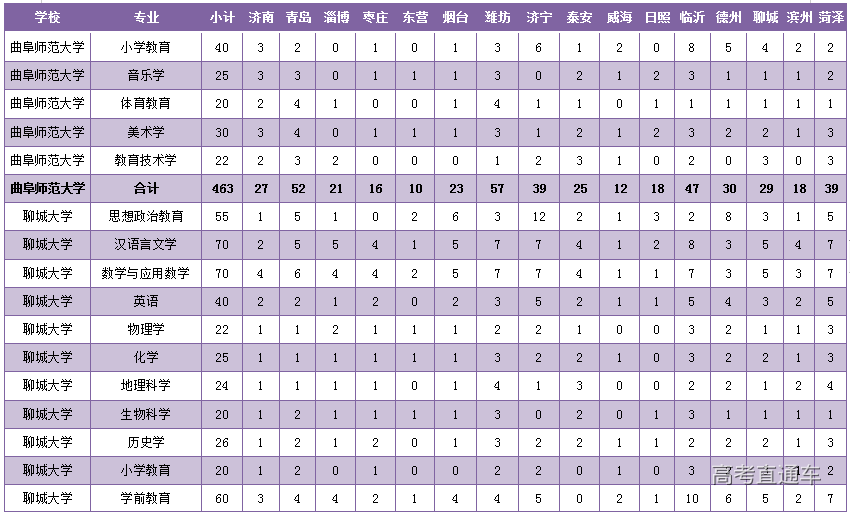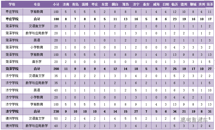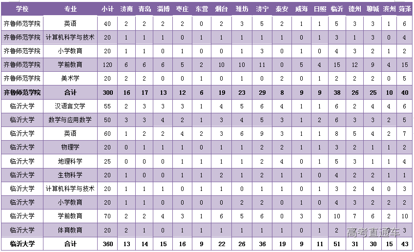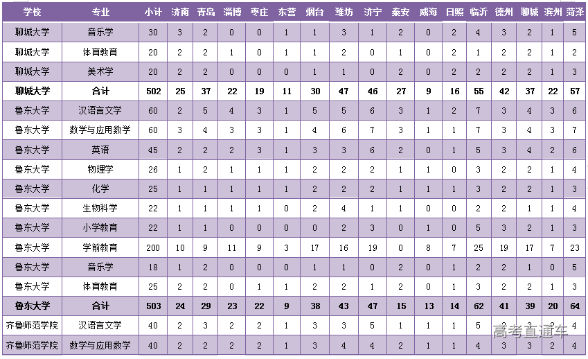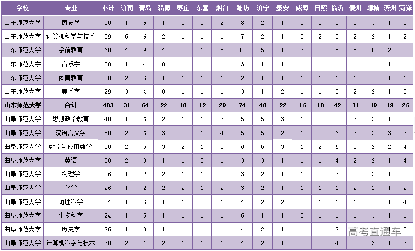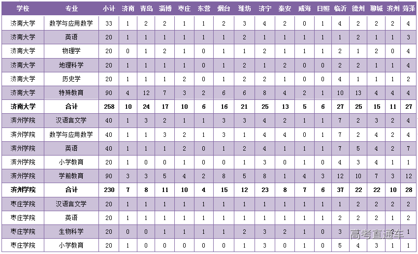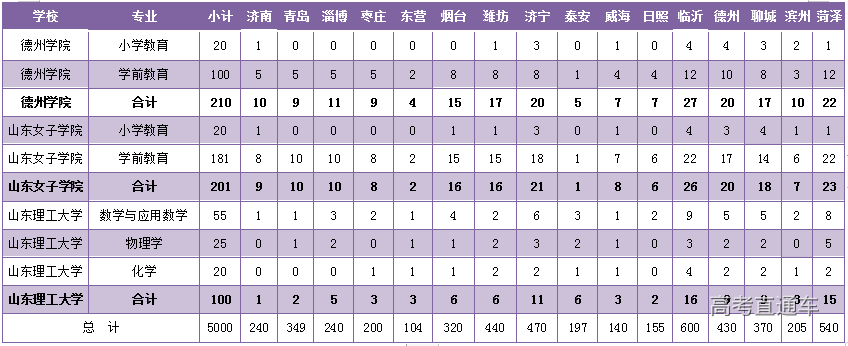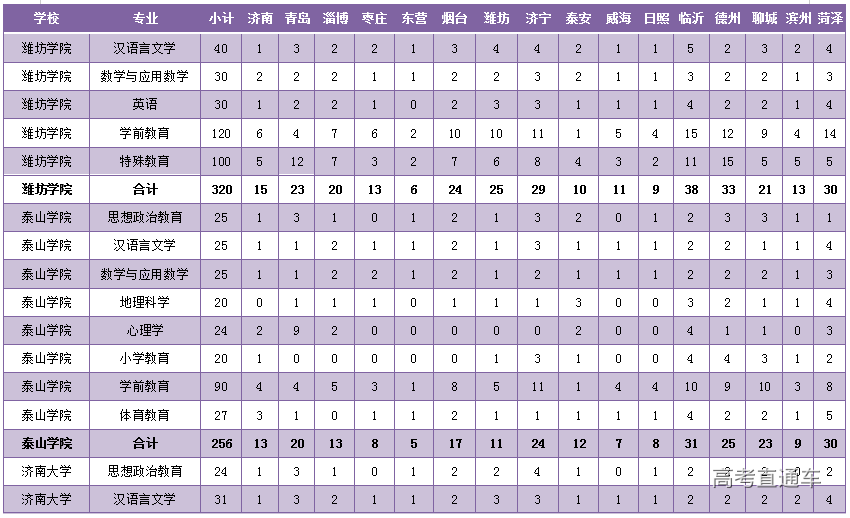 学校 | 专业 | 泰安 | 滨州 | 枣庄 | 烟台 | 合计 |