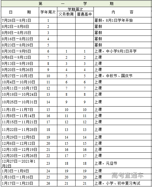 2020-2021学年第一学期,全市普通中小学校统一于2020年9月1日开学,高三年级可根据国家课程计划和学校实际教学安排,适当调整开学时间,于8月10日开始新学年开学。小学、初中寒假起始时间为2021年1月24日,普通高中为1月31日;