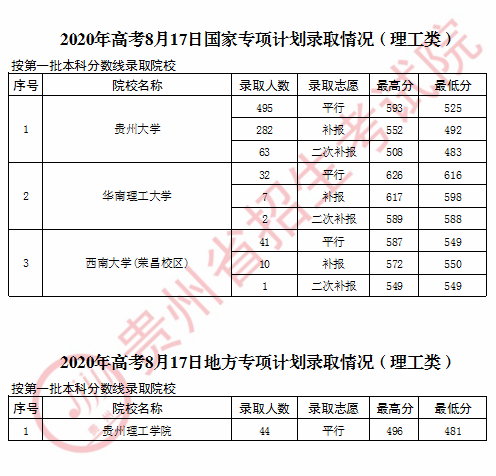 贵州8月17日普通高校招生录取情况