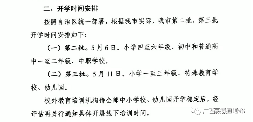 贺州市第二批开学时间为5月6日,涉及小学四至六年级、初中和普通高中一至二年级、中职学校。