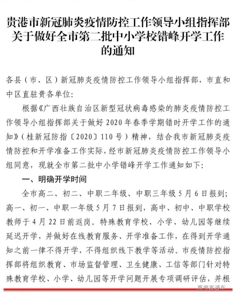 4月19日,贵港市发布通知:第二批高、初中相关年级定于5月6日、7日错峰开学,小学以下继续延迟开学。具体如下: