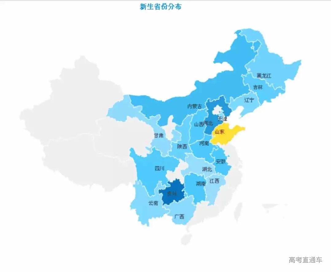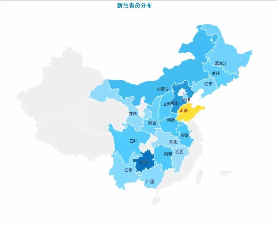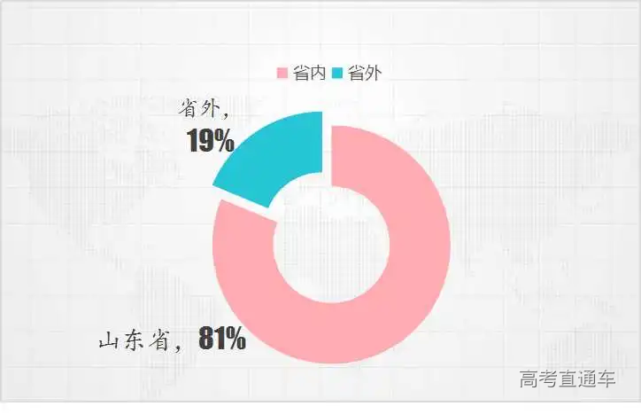 省外新生人数分布图 山东省以81%的生源占比成为生源第一大省,录取的外省生源数量前五的省份分别是:贵州、河北、江西、内蒙古、安徽。 山东省生源分布