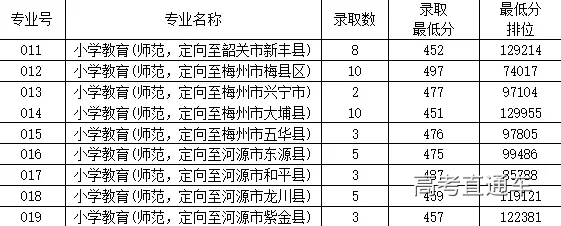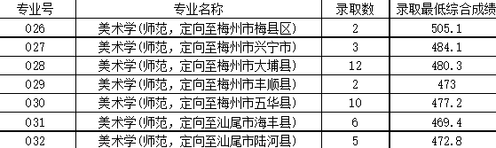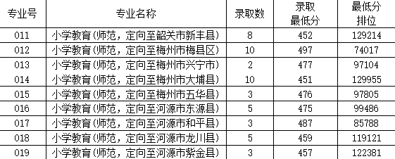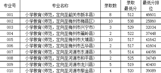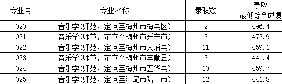 一、2019年面向广东省提前批本科教师专项(文科类)招生计划51名,投档数58个,实际录取51名,均为第一专业志愿录取。 嘉应学院2019年本科教师专项(文科类)各专业录取情况 02 二、2019年面向广东省提前批本科教师专项(理科类)招生计划49名,投档数52个,实际录取49名,均为第一专业志愿录取。 嘉应学院2019年本科教师专项(理科类)各专业录取情况 03 三、2019年面向广东省提前批本科教师专项(音乐类)招生计划40名,投档数40个,最低投档分441分,实际录取40名,均为第一专业志愿录取。 嘉应学院2019年本科教师专项(音乐类)各专业录取情况 04 四、2019年面向广东省提前批本科教师专项(美术类)招生计划40名,投档数47个,实际录取40名,均为第一专业志愿录取。 嘉应学院2019年本科教师专项(美术类)各专业录取情况 05 五、2019年面向广东省提前批本科卫生专项(理科类)招生计划136名,投档数138个,实际录取136名,均为第一专业志愿录取。 嘉应学院2019年本科卫生专项(理科类)各专业录取情况