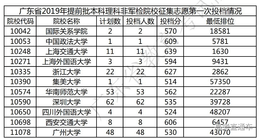 2019广东提前批本科非军检院校征集志愿第一次投档情况(理科)