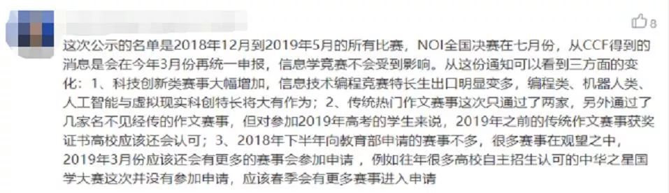 业内人士分析,对于竞赛党,唯一的影响就是参加信息学竞赛还要继续交报名费,其他则没有任何变化,和以往一样。