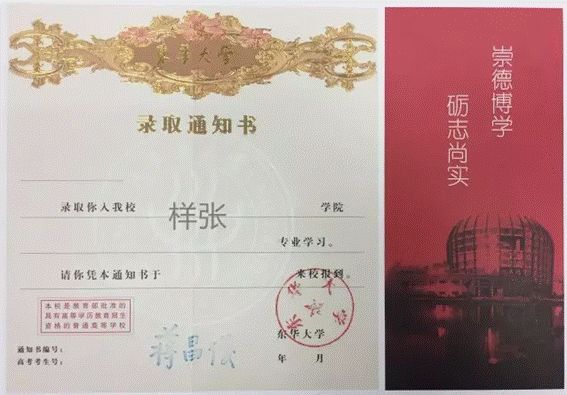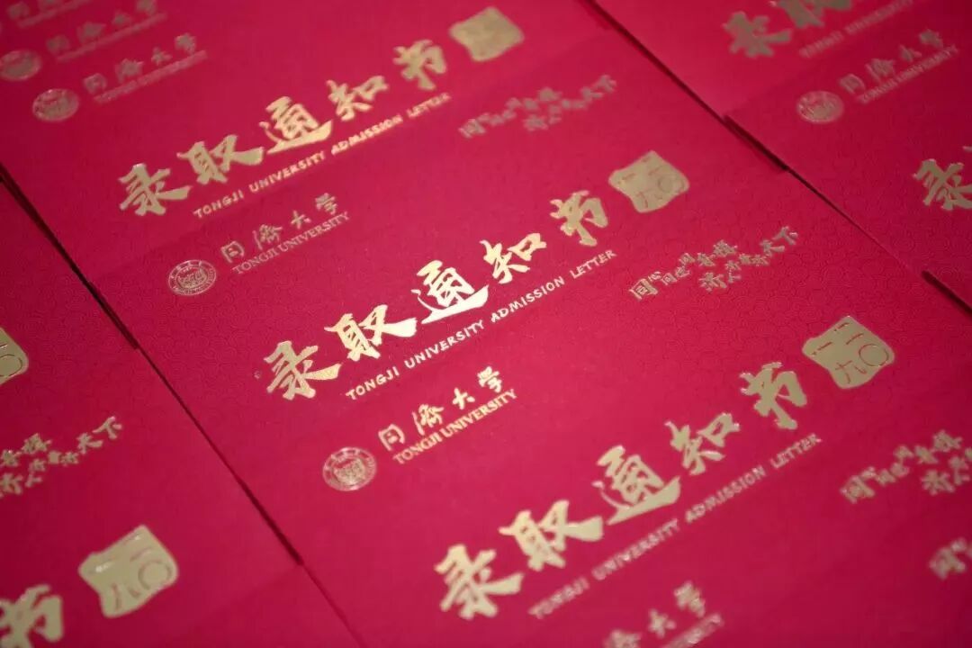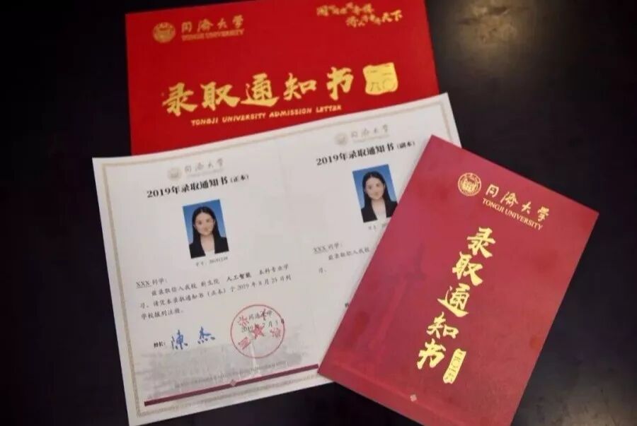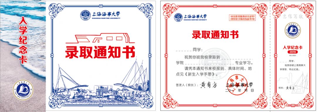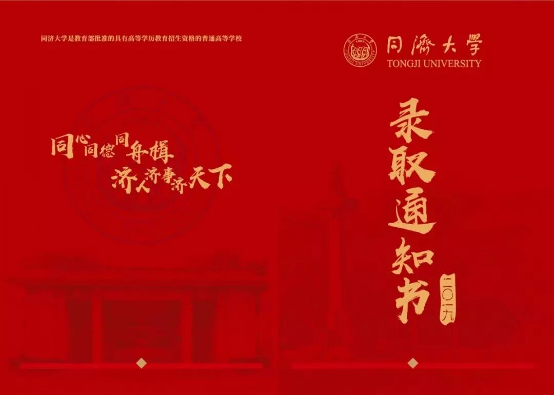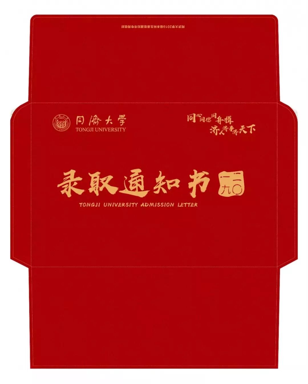 录取通知书的正面以“紫气东来门”为背景,镶嵌着“交通大学”四个字的门匾熠熠生辉,大门的后方是以上海交通大学创始人盛宣怀命名的“宣怀大道”,象征着巍巍百年学府正张臂拥抱来自五湖四海的莘莘学子。 录取通知书的反面,不仅有校训、校徽,还印写着“千里之行,始于足下,交通大学将成为你放飞梦想,谱写绚烂华章的地方”。 随通知书一起到新生手里的 还有交大的新生大礼包,先睹为快吧~ 新生专享 芳香精油交大校门3D卡 卡片展开后,交大古雅的校门—东大门将以3D折叠的方式“跳”出纸面。东大门有着朱红的宫殿式设计、绿瓦红墙、彩画飞檐,它见证了交大历经百年风云而屹立巍然的风采。卡片中还添加了由上海交大芳香植物研发中心特别研发的复方植物精油,畅心舒志、振奋怡人。卡片上预留了寄语空间,同学们可以在上面填写寄语,勉励未来的自己。 行李标签 非上海生源的交大新生可在行李上贴“上海交通大学行李标签”,通过铁路局托运,学校就将统一到铁路上海站或上海南站提取行李,使新同学可以轻轻松松来校报到入学。 校园地图 盼望着,盼望着,你和同济还差一个什么?没错,是录取通知书啦! 同济大学录取通知书以中华传统书信为原型,以《济信天下》为题,采用红金配色,融和中华传统篆刻技艺与传统书法艺术。 《济信天下》以金字镌刻“同心同德同舟楫,济人济事济天下”的同济愿景,“同舟共济,自强不息”的同济精神;另外融入同济校园中重要象征:校门和国立柱。