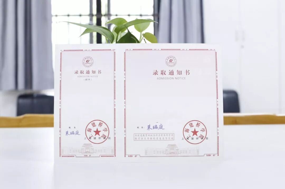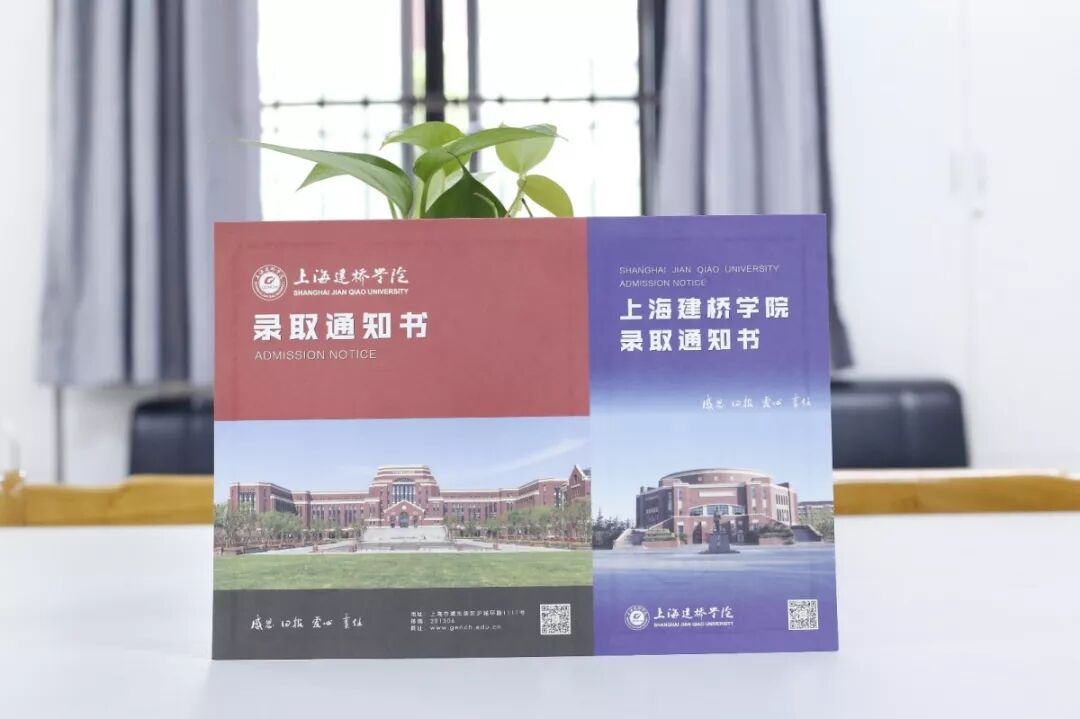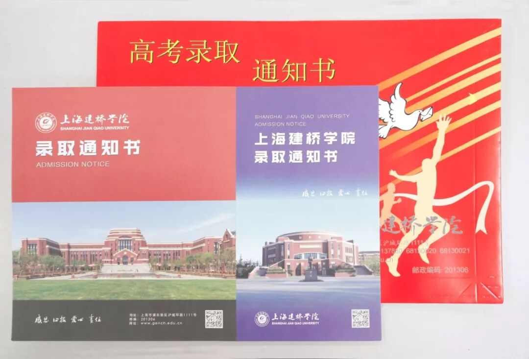 上海建桥学院录取通知书的封面为学校标志性建筑物——学校图书馆、雷锋像,还有SJQU和校徽标识。