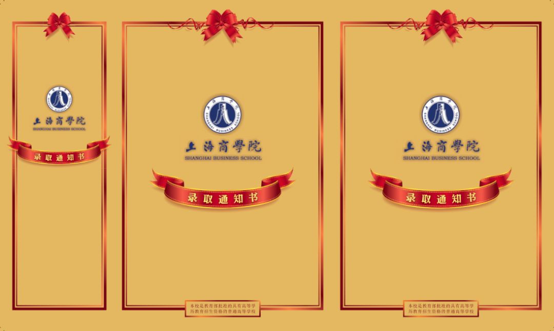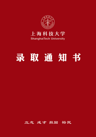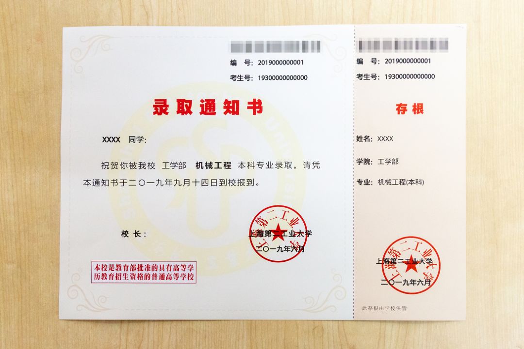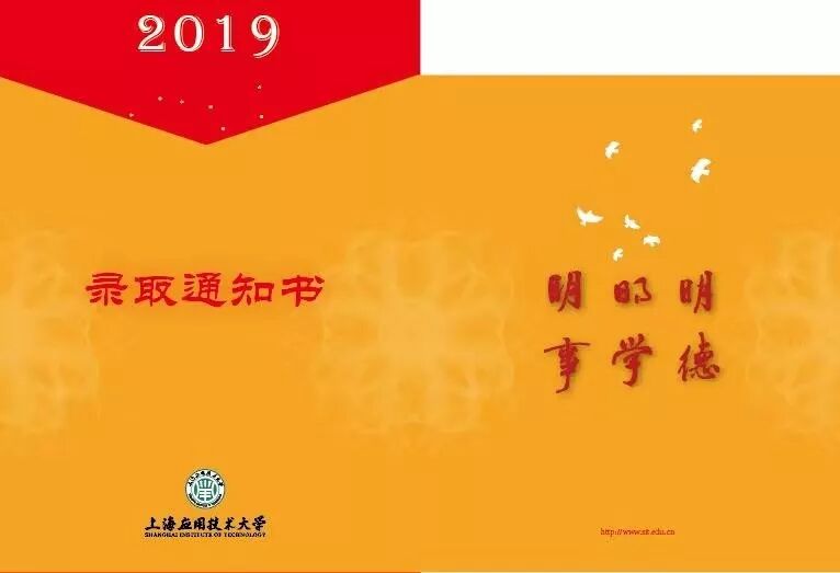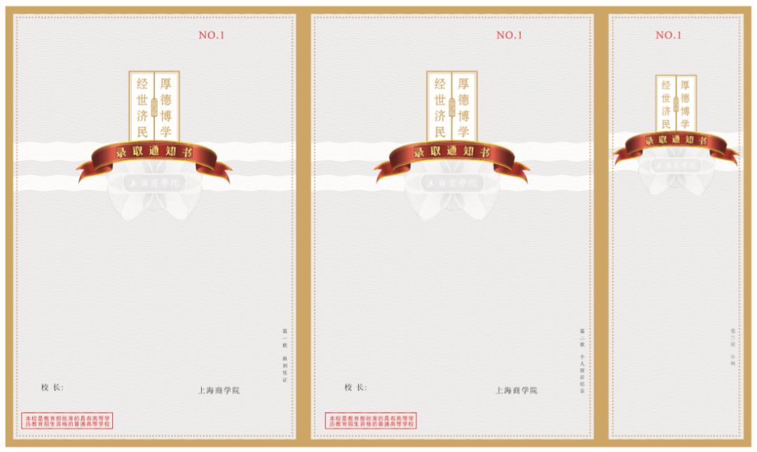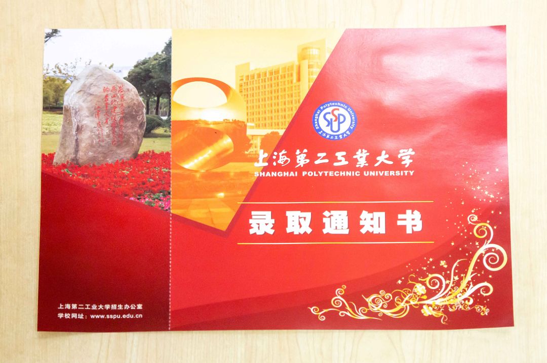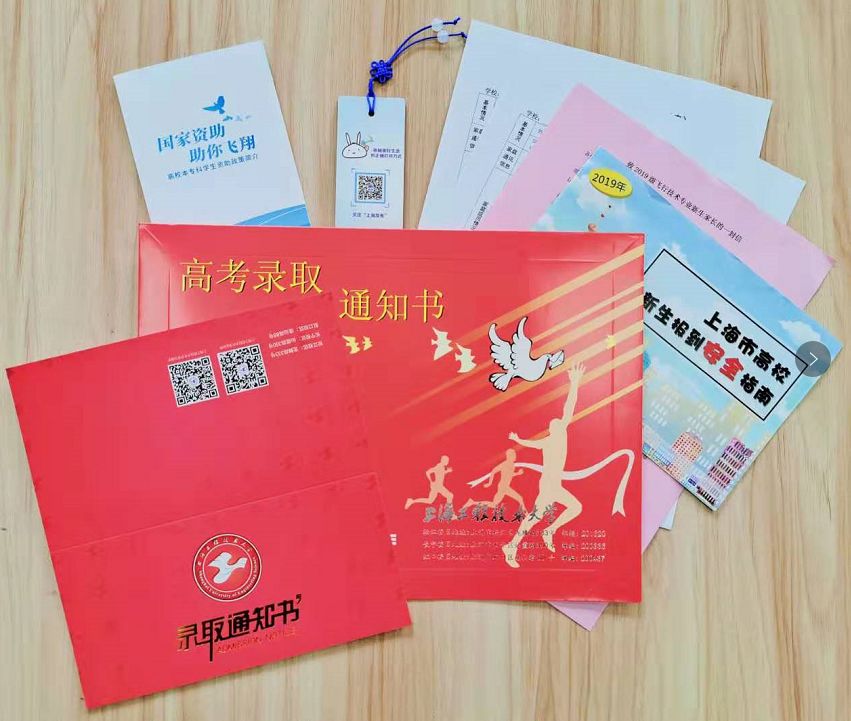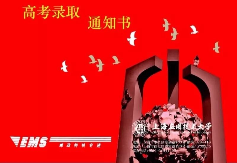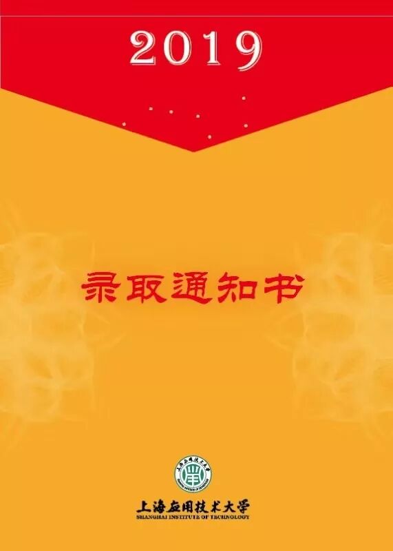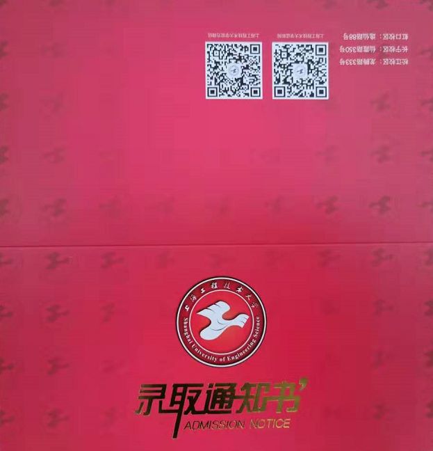 上海应用技术大学的录取通知书正面选用传统的红色,显示喜气;正上方的北斗七星图案中间的文曲星表示入学学子们的智慧,此位置镂空用于配置校徽,以便封套与证书固定;学生录取信息两边的团花图形是配合了已有的学位证书设计。