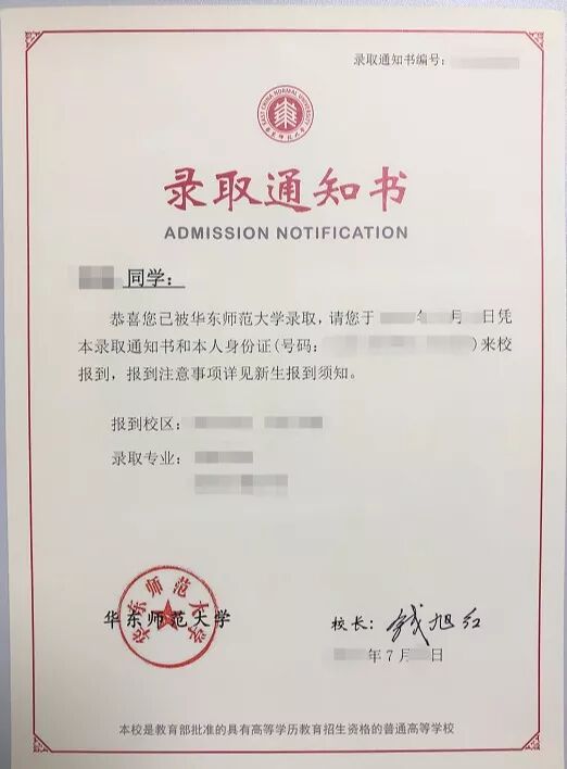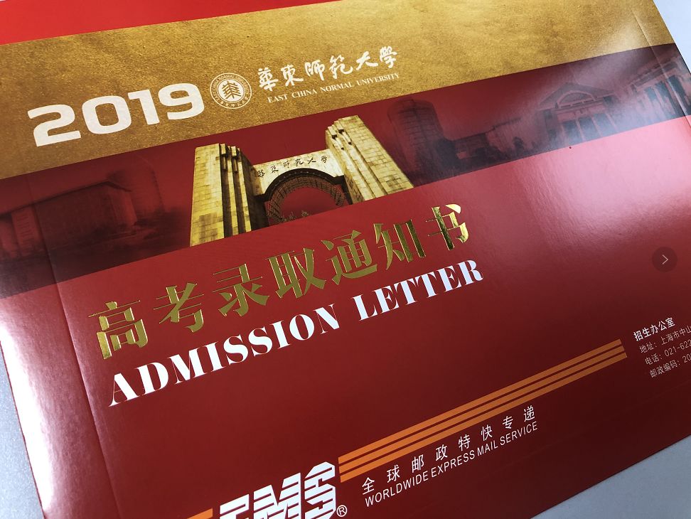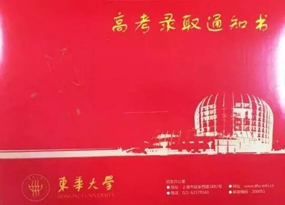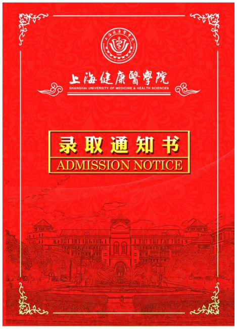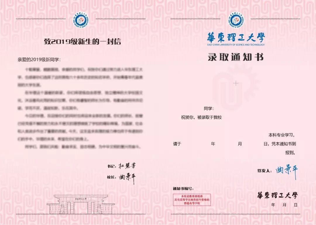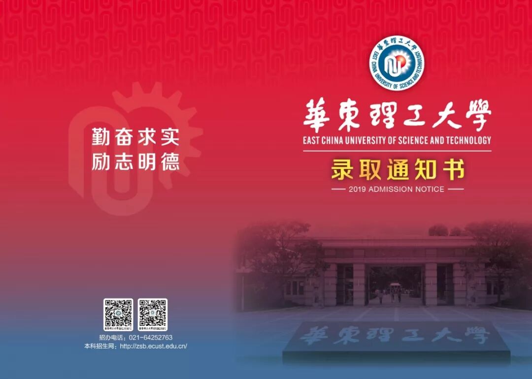 华东理工大学的录取通知书采用对折形式,正面颜色采用喜庆红和华理蓝过渡渐变形式,体现华理喜庆形象。“录取通知书”五个金色立体字寓意“金榜题名”。底部为华理正校门,蕴含考生即将成为华理学子之意。