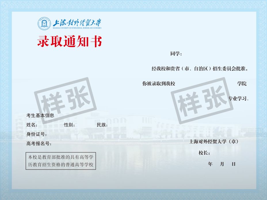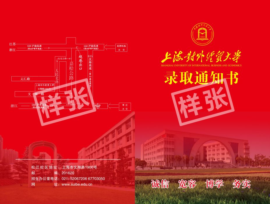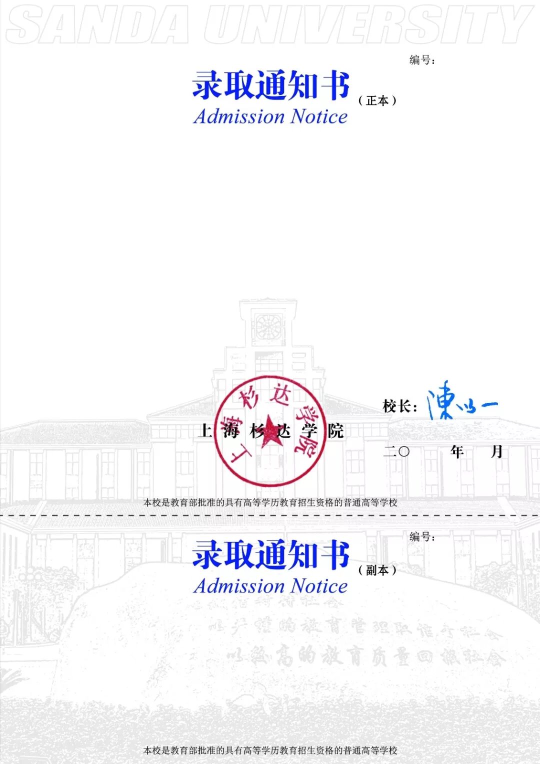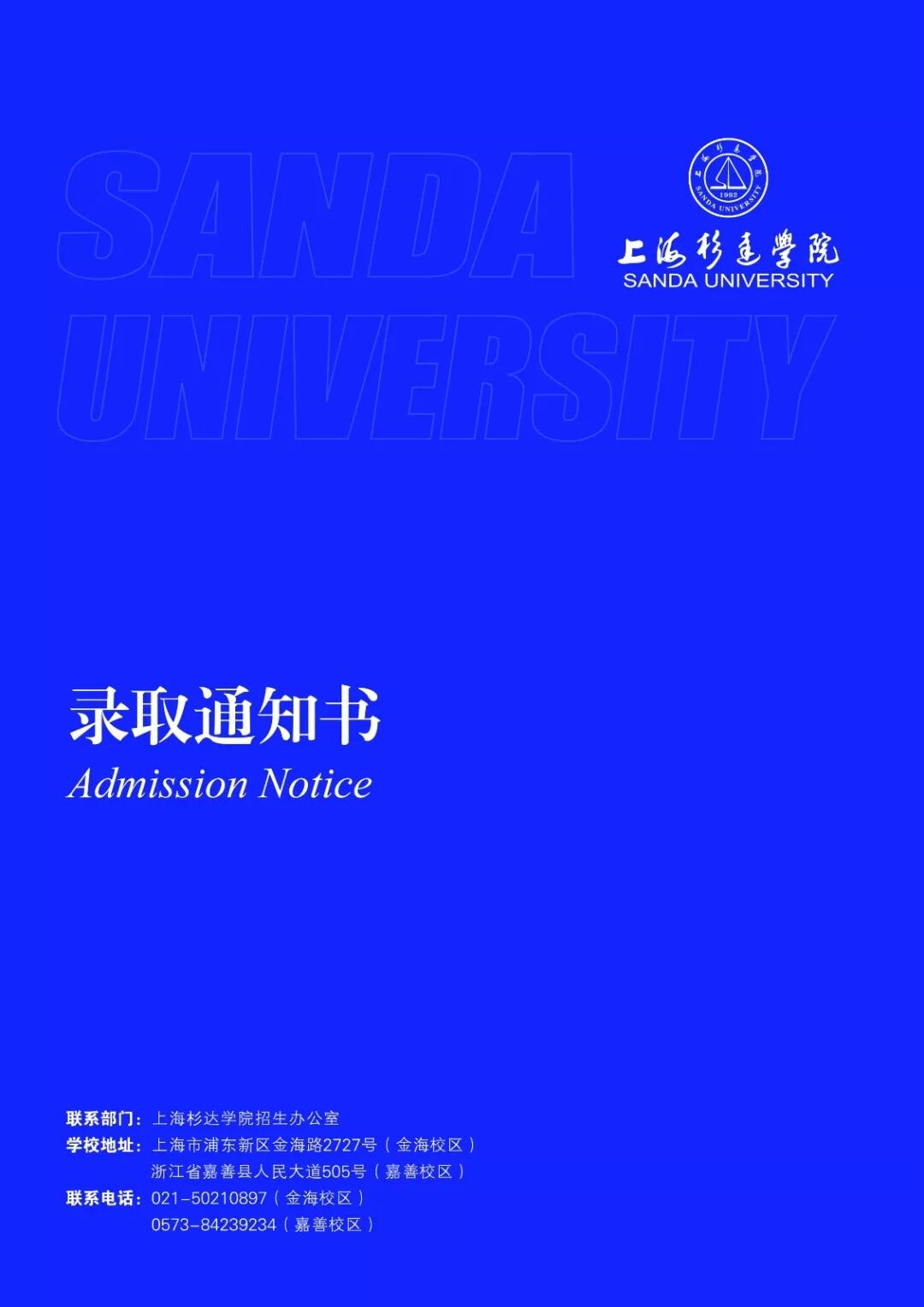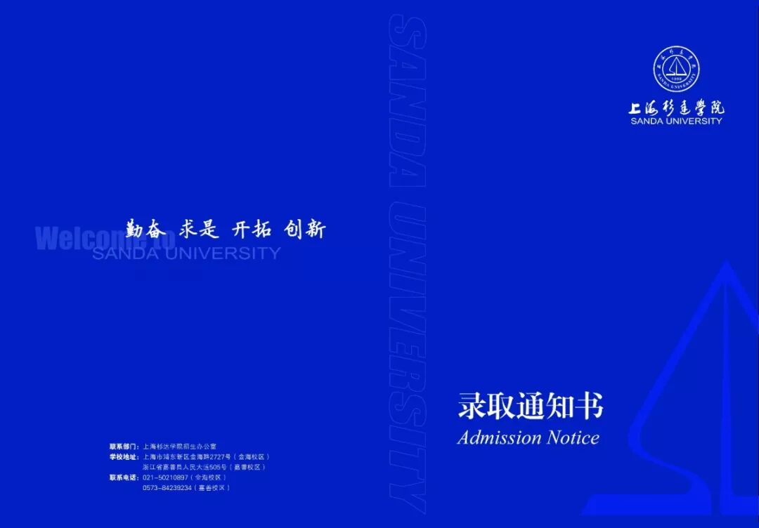 上海杉达学院录取通知书采用文件封套内置通知书正本的形式,以蓝色为主色调,印有校标、校训“勤奋求是,开拓创新”以及图书馆和教学群楼侧影等元素,整体设计显得正规、大方,象征着永恒、希望。在未来四年的每一个时刻,杉达将陪伴同学们成长。