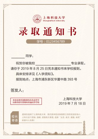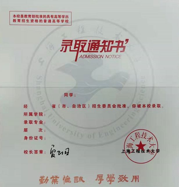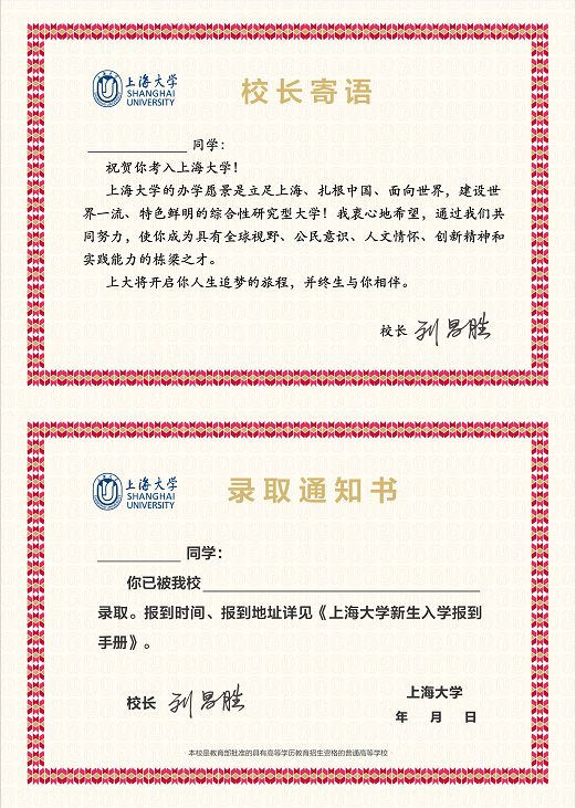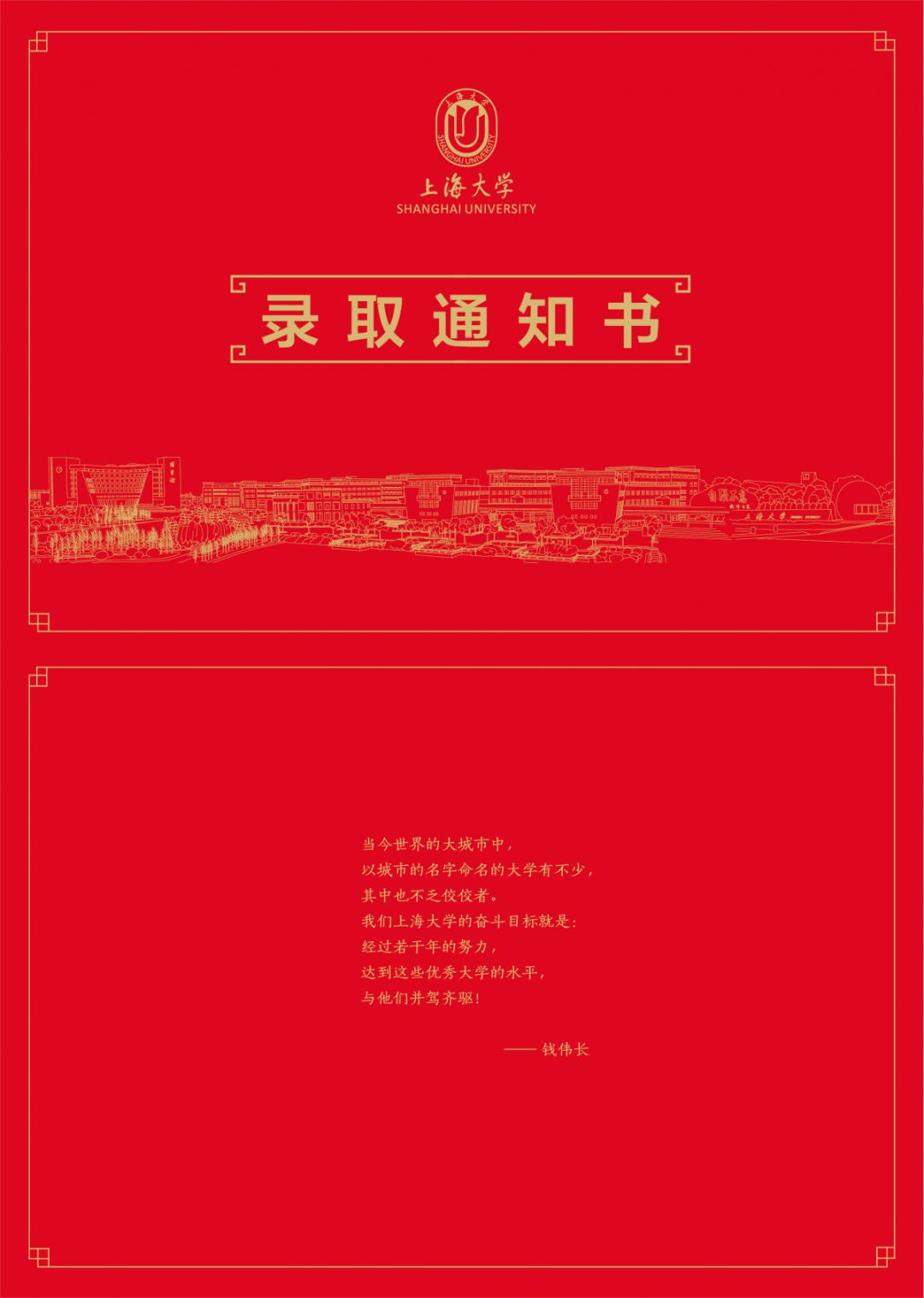 录取通知书设计为上下两部分,上半页校长寄语可分开单独珍藏,放在相框中让新生在逐梦的路上不会迷失方向。希望同学们在上海大学的四年里能不负青春,践行“自强不息”“先天下之忧而忧,后天下之乐而乐”的校训精神,成为具有全球视野、公民意识、人文情怀、创新精神、实践能力的栋梁之材。