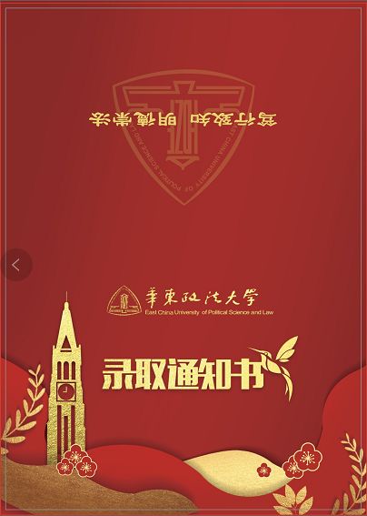 通知书外页选取了松江校区图书馆明珠楼的抽象图形,钟楼时间指向9点钟方向,取大学生就像八九点钟的太阳之寓意,也表明学校与新生相聚在金秋九月,表示欢迎之意;报喜鸟、麦穗、花朵的元素,象征着收获、吉祥,寓意着对新生考入华政的祝贺;“笃行致知,明德崇法”的校训,既体现我校法律特色,也表达了希望华政学子成为国家栋梁的美好愿景。