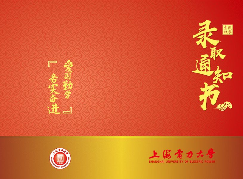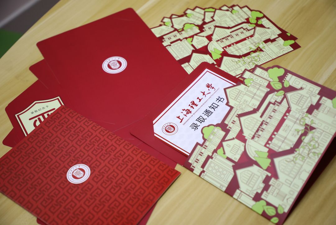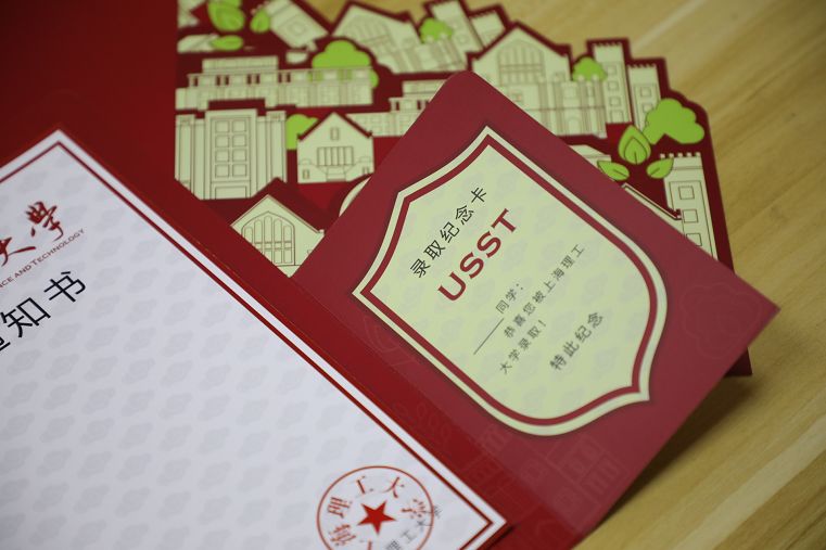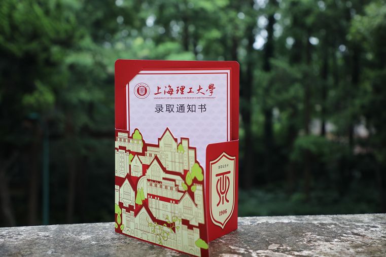 上海理工大学录取通知书以上理红为主调,采用折页的设计,封面为上海理工大学优秀历史建筑的剪影,翻开折页,内部印有学校“信义勤爱、思学志远”的校训,展示着学校深深的历史底蕴和文化传承。