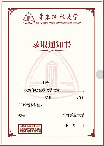 华政的录取通知书整体为竖向折页式,整体以华政红为主基调,同时加入了校名、校徽、校训等必要元素,红色表示着对2019级新生的盼望和欢迎,表达喜悦之意。