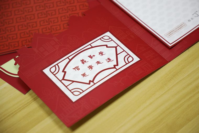 封套选用传统的金黄色,寓意"金榜题名",校训上面飞翔的白鸽预示理想的放飞。