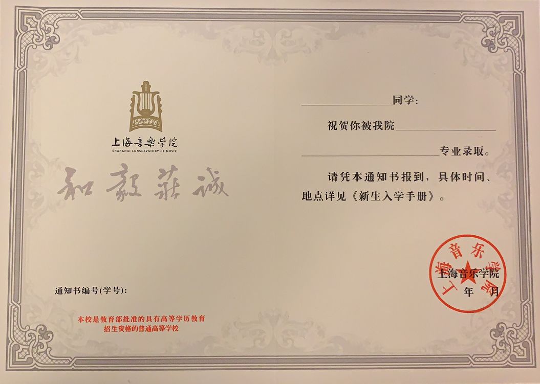 左右翻页的通知书充满着仪式感,编钟与里拉琴构成的“银琴黄钟”校徽,象征上音中西并举的办学理念,校徽上所刻的小篆“上音”亦昭示了音乐历史之古老、上音历史之悠久。校徽下方是上音从创立之初就恪守至今的校训——和毅庄诚,也是对新上音人的寄语与期许。