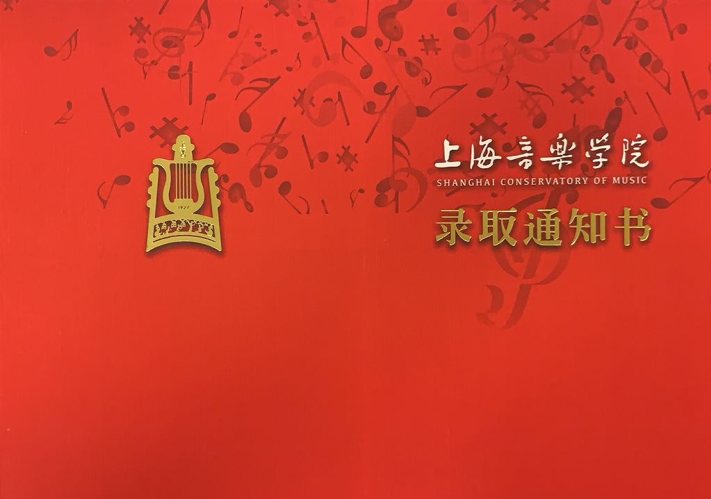 上海音乐学院录取通知书封面以庆典色——上音暖红为主,辅以“上音金”院徽和漫天洒落的音符,象征着音乐乃上音之魂,表达了上音人热烈奔放的情感与金子般的心灵。