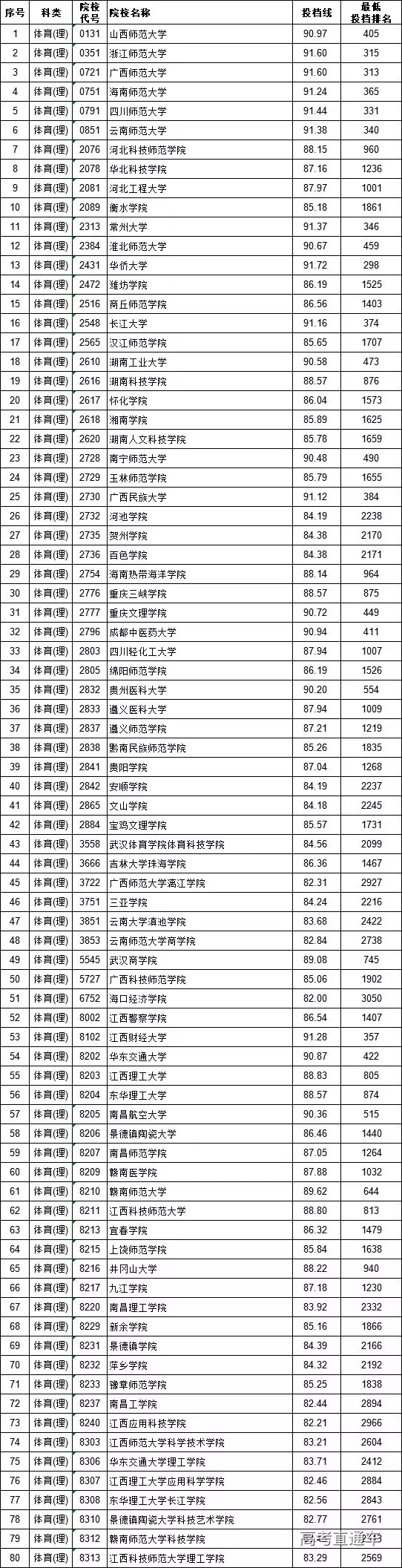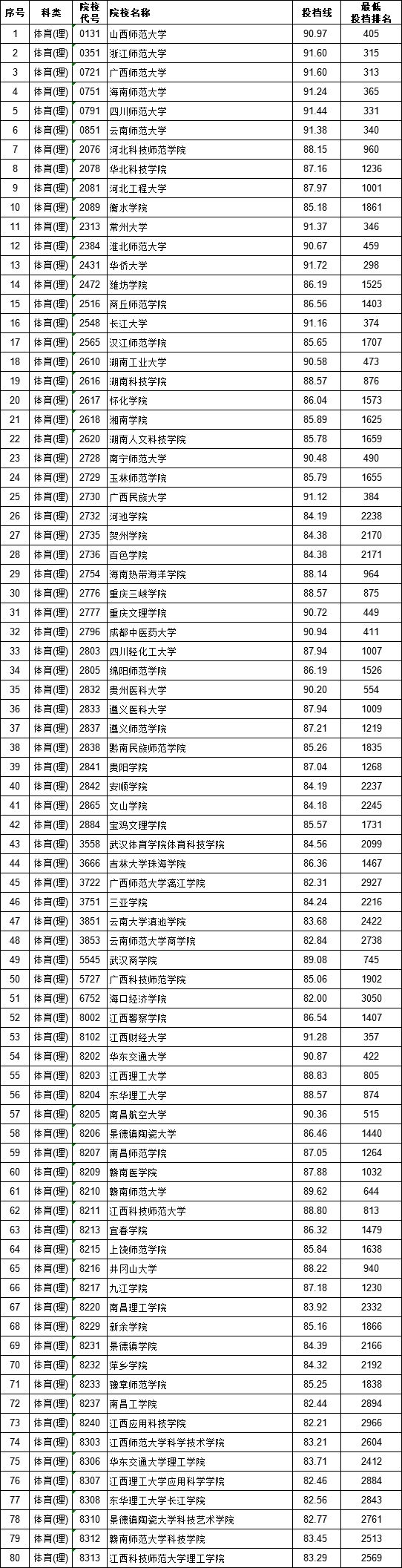 7月25日下午,省教育考试院召开江西省2019年普通高校招生录取工作第四次新闻发布会,回顾前一阶段的录取情况,公布第二批本科批次的投档情况。 7月24日,我省提前批本科、国家专项计划本科和第一批本科批次的招生任务基本完成,共录取考生61926名,其中,文史类9351名,理工类39500名,艺术类12784名,体育类291名。 一 招生计划情况 今年第二批本科招生分为文史、理工、艺术、体育和三校生类本科五大类进行录取。 本批次总的招生计划数为 94603名,其中文史类计划28152名;理工类计划56465名;艺术类计划6755名;体育类计划2489名;三校生文理类本科计划734名,三校生艺术类本科计划8名。 二 平行志愿投档情况 为了确保第二批本科院校平行志愿投档和录取工作的顺利进行,7月23日先后进行了三次模拟投档,测算各院校的生源情况。今天的正式投档是根据各高校最终确定的投档比例进行的。 文史类投档情况 参加本批次录取的文史类院校共有625所,平行志愿投档满额的院校有603所,投档分居前的院校分别是: 1.集美大学 569分 2.广东金融学院 569分 3.上海立信会计金融学院 568分 4.上海海关学院 567分 5.浙江传媒学院 567分 理工类投档情况 参加本批次录取的理工类院校共有768所,平行志愿投档满额的院校有727所,投档分居前的院校分别是: 1.重庆邮电大学 552分 2.广东金融学院 545分 3.天津工业大学 544分 4.徐州医科大学 543分 5.上海立信会计金融学院 541分 体育类投档情况 参加本批次体育类专业录取的院校共有80所,投档规则为:在专业、文化成绩均达到录取控制线的考生中依据体育专业成绩从高分到低分,实行平行志愿投档。平行志愿投档后,79所院校满额。专业成绩投档排名居前的院校是: 1.华侨大学 91.72分 2.广西师范大学 91.60分 3.浙江师范大学 91.60分 4.四川师范大学 91.44分 5.云南师范大学 91.38分 三校生文理类本科投档情况 参加本批次三校生文理录取的院校共有8所,平行志愿投档7所院校满额,投档分靠前的院校分别是: 1.江西农业大学 499分 2.江西科技师范大学 497分 3.南昌理工学院 492分 艺术类专业投档情况 列入二本批次艺术类录取的院校为省内外民办院校和独立学院。其中认可省艺术统考成绩的专业实行平行志愿投档,使用校考成绩的专业和三校生本科艺术类专业实行单志愿投档。投档顺序为:先投平行志愿,后投单志愿。目前,投档工作正在进行。 三 生源特点 1.由于二本批次是录取本科院校的最后一个批次,考生选报志愿较为理性和慎重,公办院校、民办院校与独立学院搭配填报,梯度落差明显,志愿满足率显著提高。 2.上海、广东、浙江、福建等大城市及沿海地区的院校生源优势明显。东北、西部边远地区以及内陆中小城市的部分院校生源相对欠缺。金融、医学类院校录取分数普遍较高。投档分数达到一本控制分数线的院校,文史类有 54所,理工类67所。 3.本省院校生源质量继续提升,个别首次在二本批次招生的本科院校存在缺额。 第二批本科招生院校及录取类别较多,因此,7月28日9时-15时,7月30日9时-15时将进行两次网上征集志愿。届时未被录取的考生可及时登录江西省教育考试院网站进行网上征集志愿的填报。