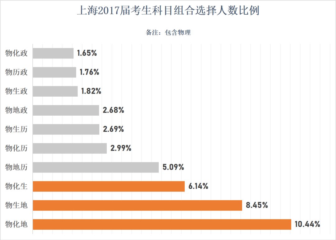 从山东和上海的选科数据来看,在搭配“物理”的科目组合中,考生相对集中,排名前三的选择是: