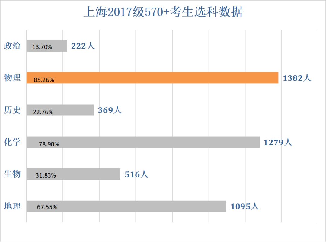 在2017年上海高考中,570分以上考生总计1621人。占全部考生的3.43%。在这些高分考生上,选考物理比例最高,达到了85.26%。