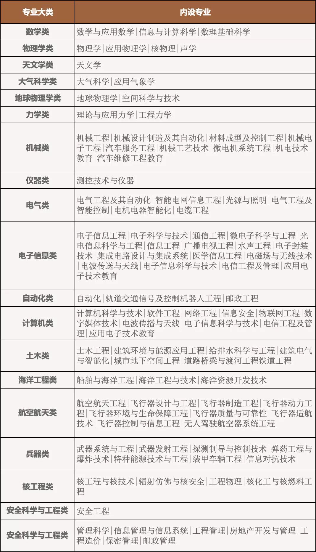 有土木类、机械类、力学类、交通运输类、水利类、海洋工程类、航空公司航天类、兵器类……