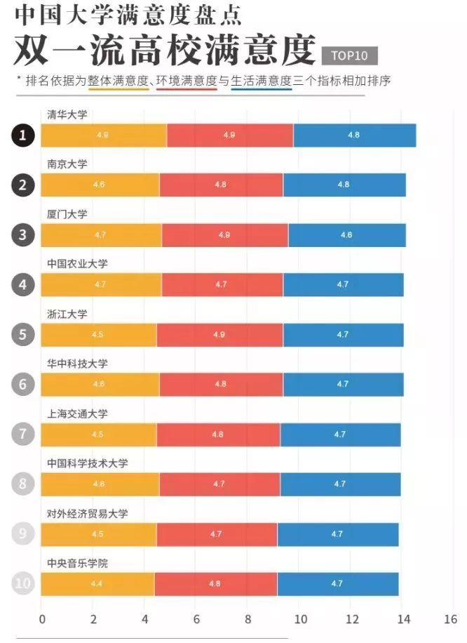 其后的榜单中,第二名到第八名也均为原985工程中的“名牌大学”,可见这些院校不仅学术实力突出,环境与生活也通常能让学生满意。