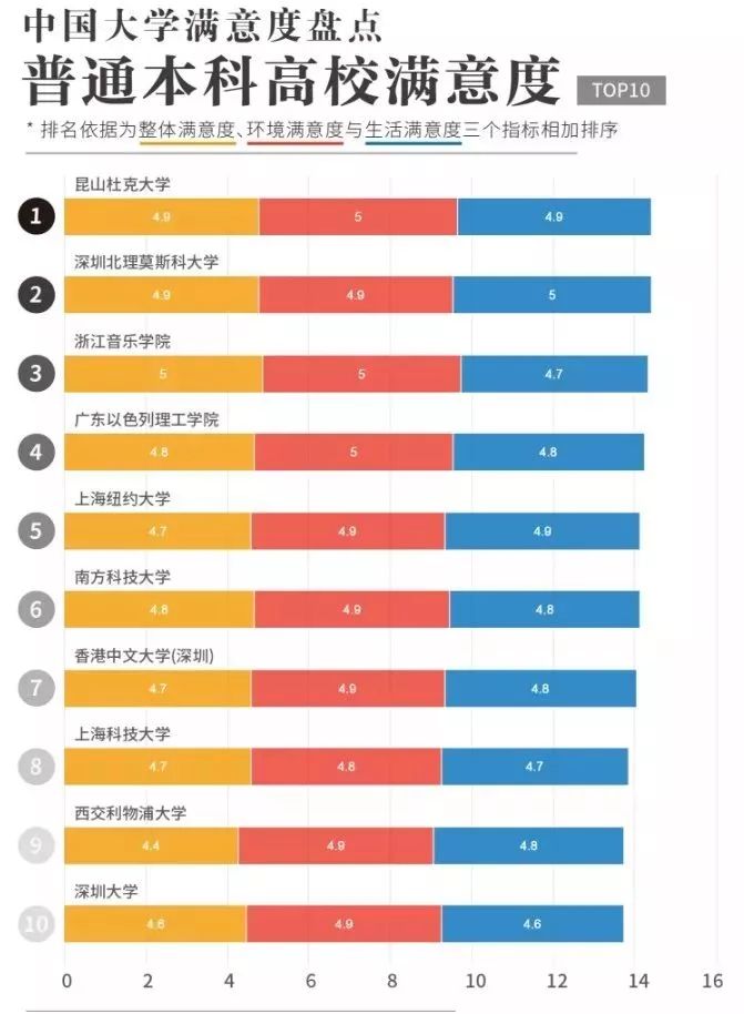 反观那些暂时没有入选双一流工程的高校,它们的满意度情况怎样?结果其实让人惊讶——除浙江音乐学院与深圳大学,位列前十的八所高校均为近年才崛起的“新式大学”。