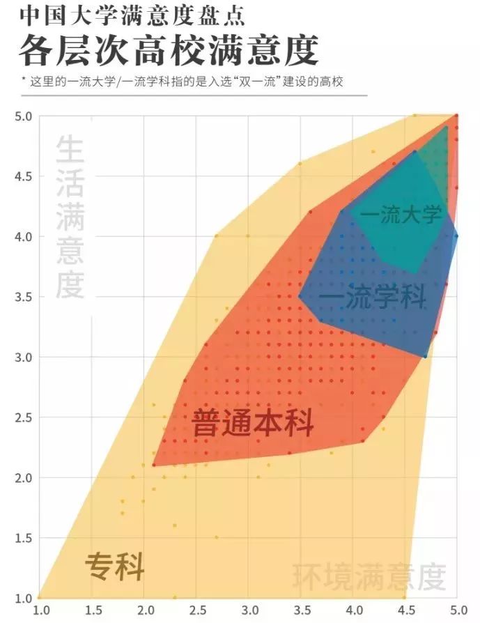 但通过对2676所大学满意度数据的散点图绘制,可以发现不同层次的院校,满意度区分其实很明显——入选“一流大学”名单的双一流工程高校,无论是生活满意度和环境满意度,都高于入选“一流学科”的高校,其次才是普通本科以及专科。
