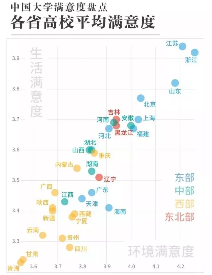 将视角转到省份上,结论变得更加明朗。江苏与浙江高校的平均满意度位于各省前列,紧随其后的是一批东部省份。而西部地区的高校,无论是生活还是环境满意度,都落后于中东部。看来,诸多家长坚信的“要让孩子去/留在东部沿海读书”的观点,的确有它的合理性。