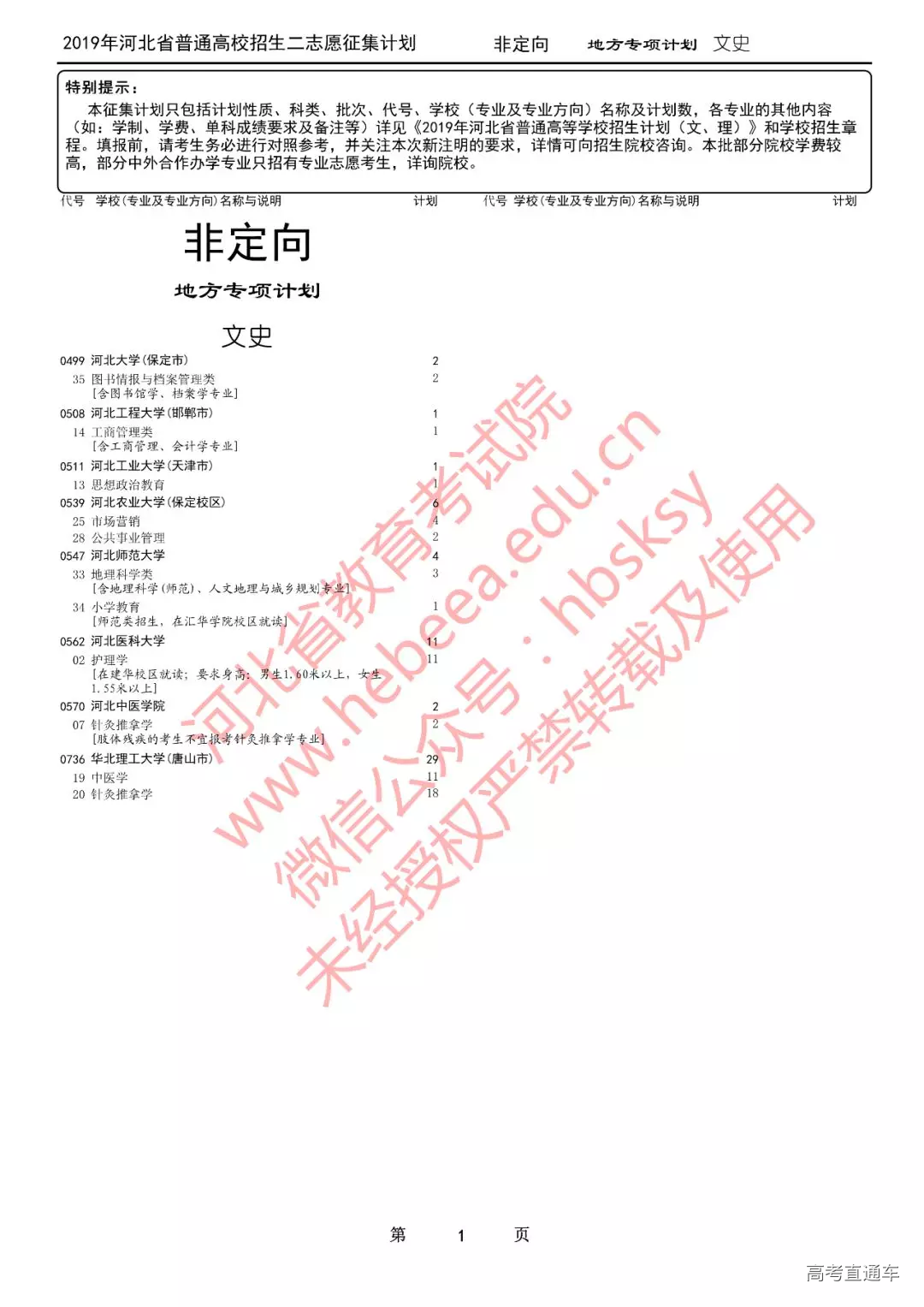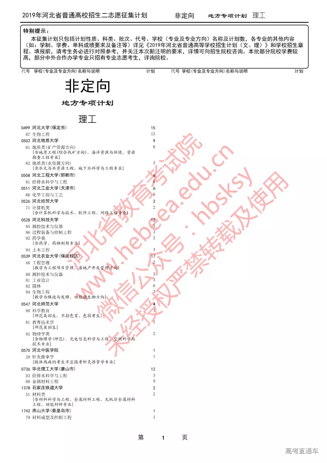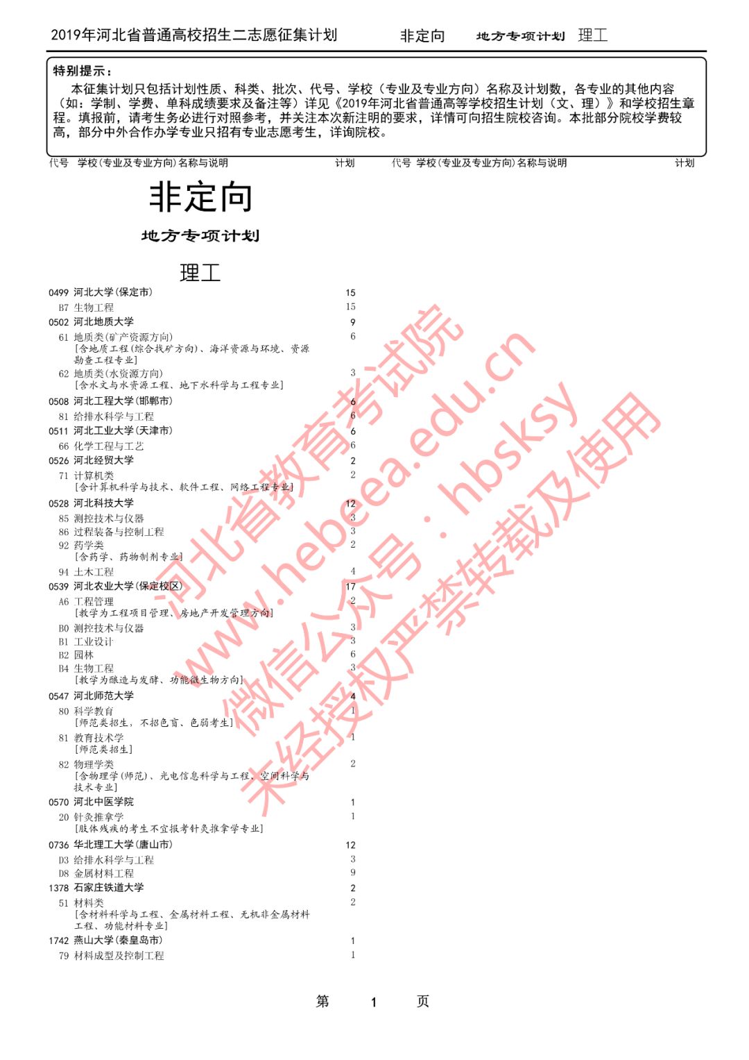 特别提醒:本征集计划只包括计划性质、科类、批次、代号、学校(专业及专业方向)名称及计划数,各专业的其他内容(如:学制、学费、单科成绩要求及备注等)详见《2019年河北省普通高等学校招生计划(文、理)》和学校招生章程。填报前,请考生务必进行对照参考,并关注本次新注明的要求,详情可向招生院校咨询。
