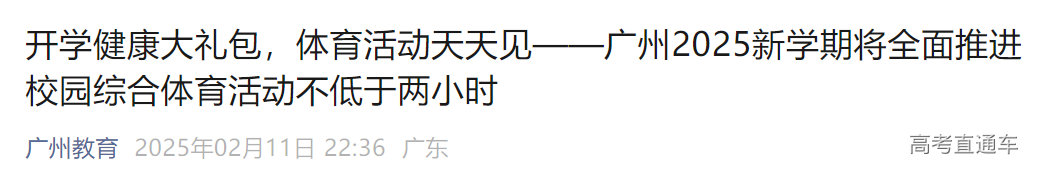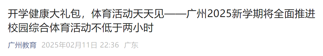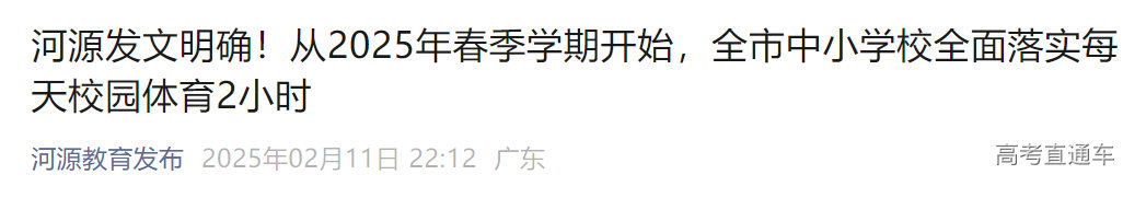 日前,河源市教育局发布《关于落实中小学生每天综合体育活动时间不低于2小时的通知》(以下简称《通知》),明确从2025年春季学期开始,全市中小学校普遍开展“校园阳光体育活动”,全面落实每天校园体育2小时,推进落实中小学校每天1节体育课(含体育活动课,下同)。