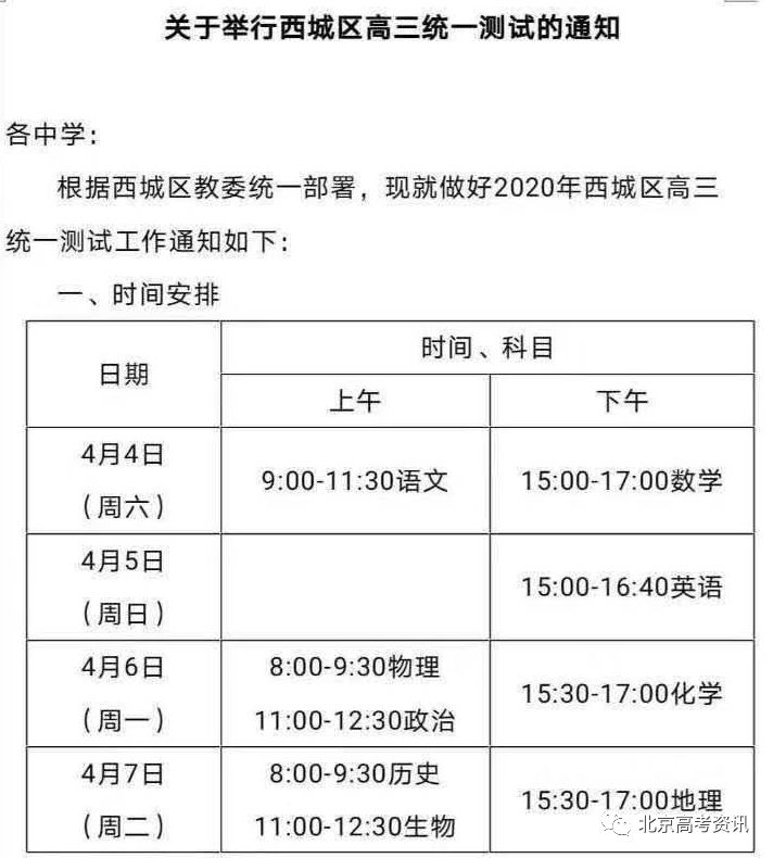 根据北京高考资讯收集到的相关信息,西城区高三一模考试时间为4月4日-7日(周六至周二),考试时间为清明节,共4天,各科目考试安排与2020年高考相同。