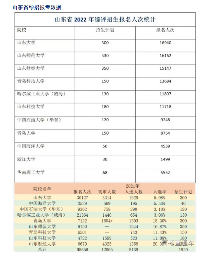2022年,9所高校在山东开展综评招生试点工作,分别是山东大学、中国海洋大学、中国石油大学(华东)、哈尔滨工业大学(威海)、青岛大学、山东师范大学、山东科技大学、青岛科技大学、山东财经大学。