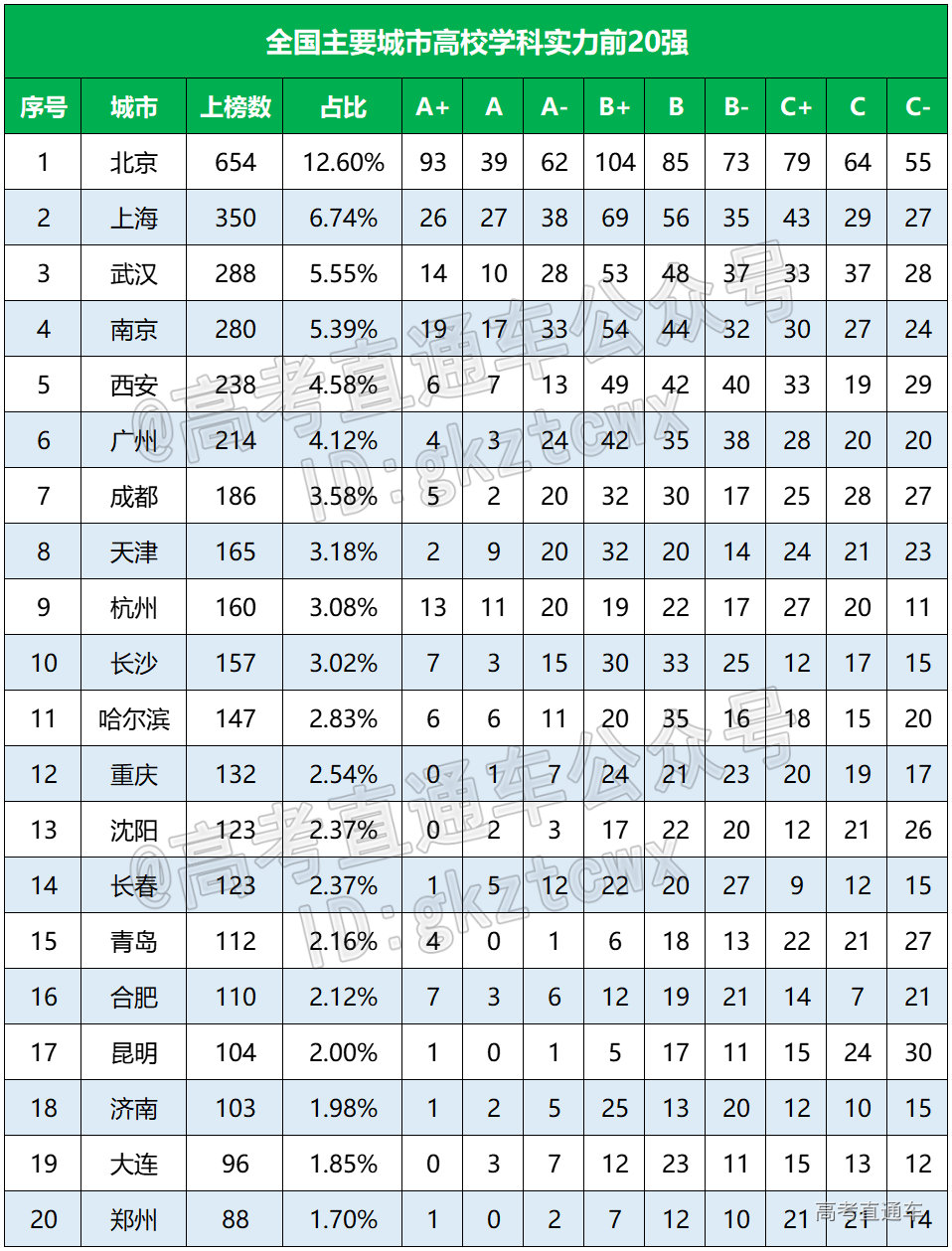 在C-以上学科总数上,前十名分别是:北京、上海、南京、武汉、西安、广州、成都、天津、杭州、长沙;