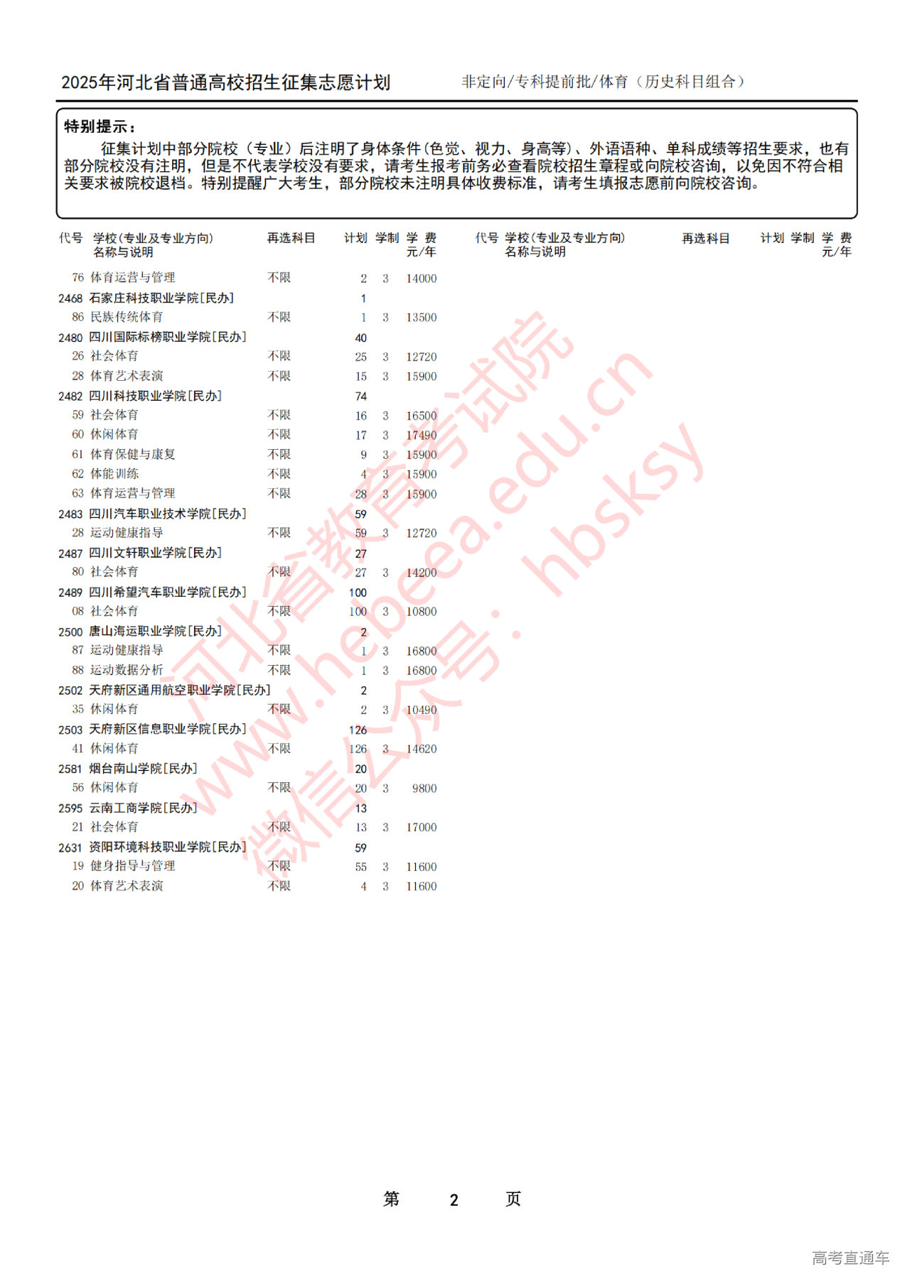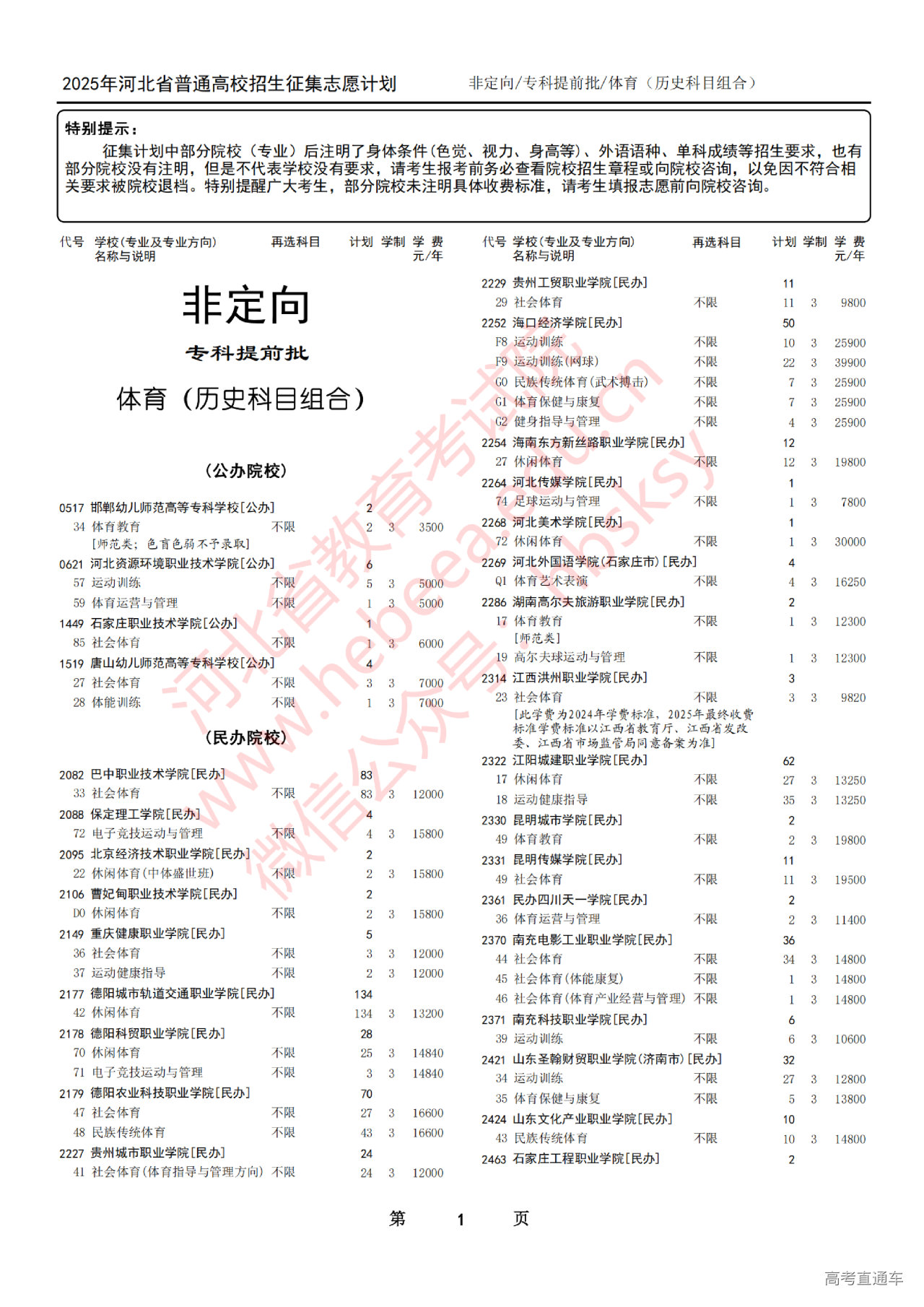 河北2025年专科提前批体育(历史科目组合)征集志愿计划