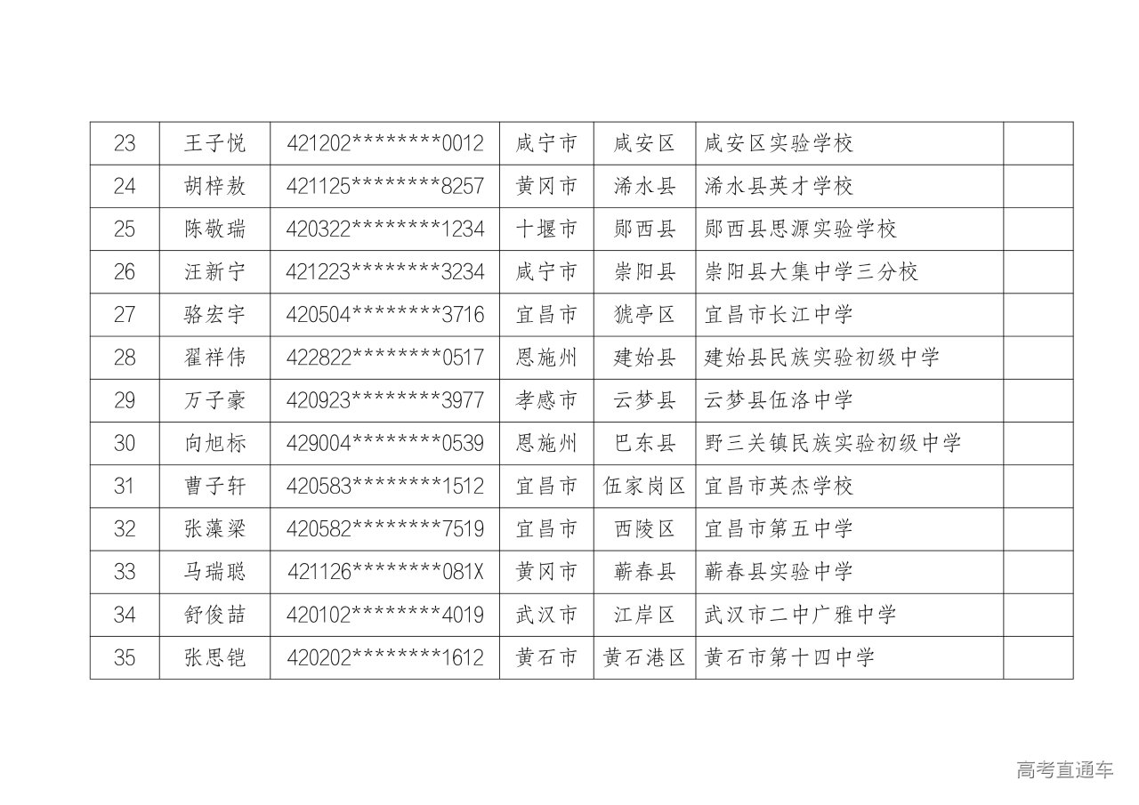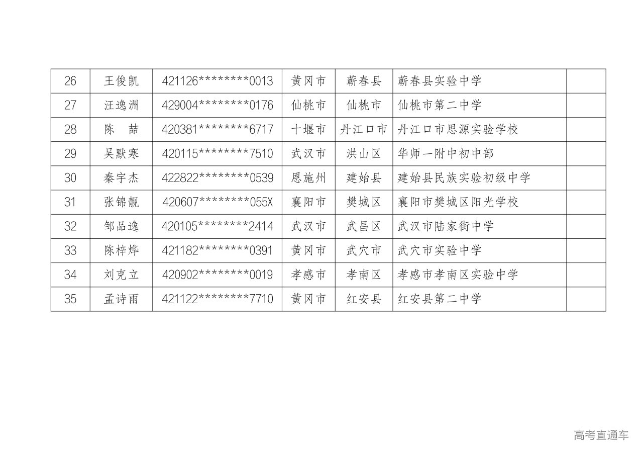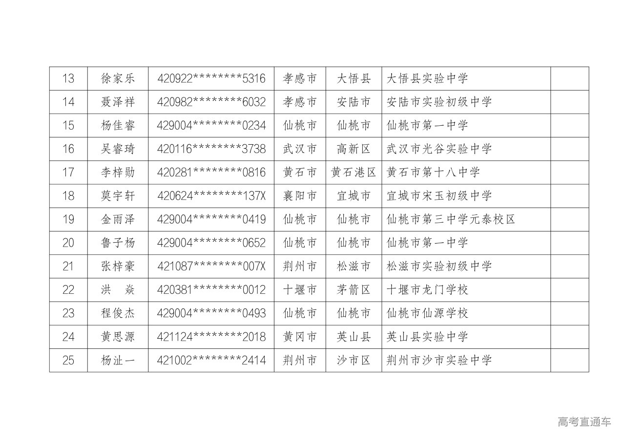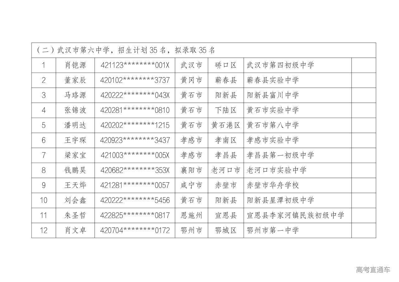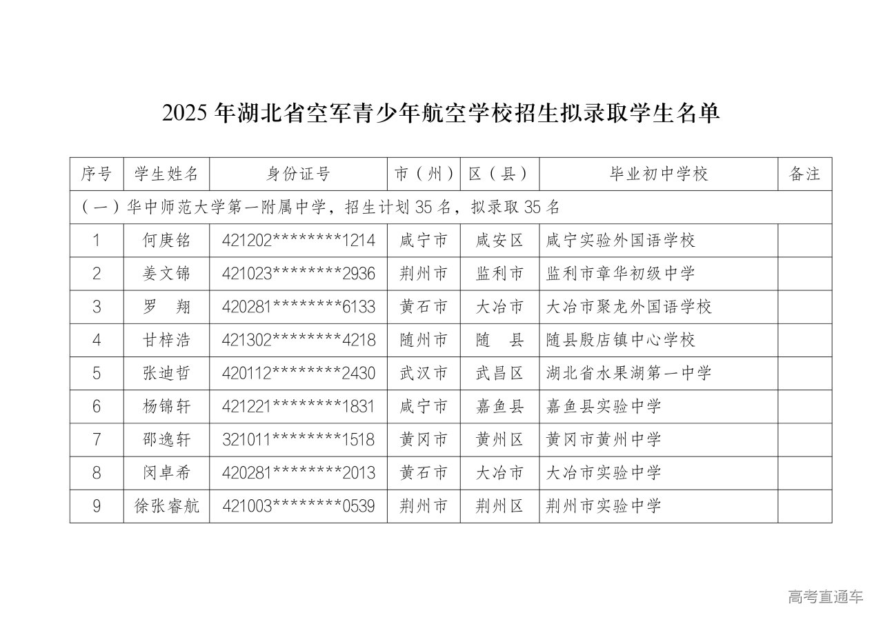 根据空军青少年航空学校建设管理办公室《关于做好2025年空军青少年航空学校招生工作的通知》(〔2025〕2号)、湖北省教育厅办公室《关于做好2025年度湖北省空军青少年航空学校招生工作的通知》(鄂教基办函〔2024〕29号)等文件精神,经定选检测和电脑派位,2025年度湖北省空军青少年航空学校招生拟录取考生70名。其中,华中师范大学第一附属中学拟录取35名,武汉市第六中学拟录取35名,现将拟录取考生名单予以公示。