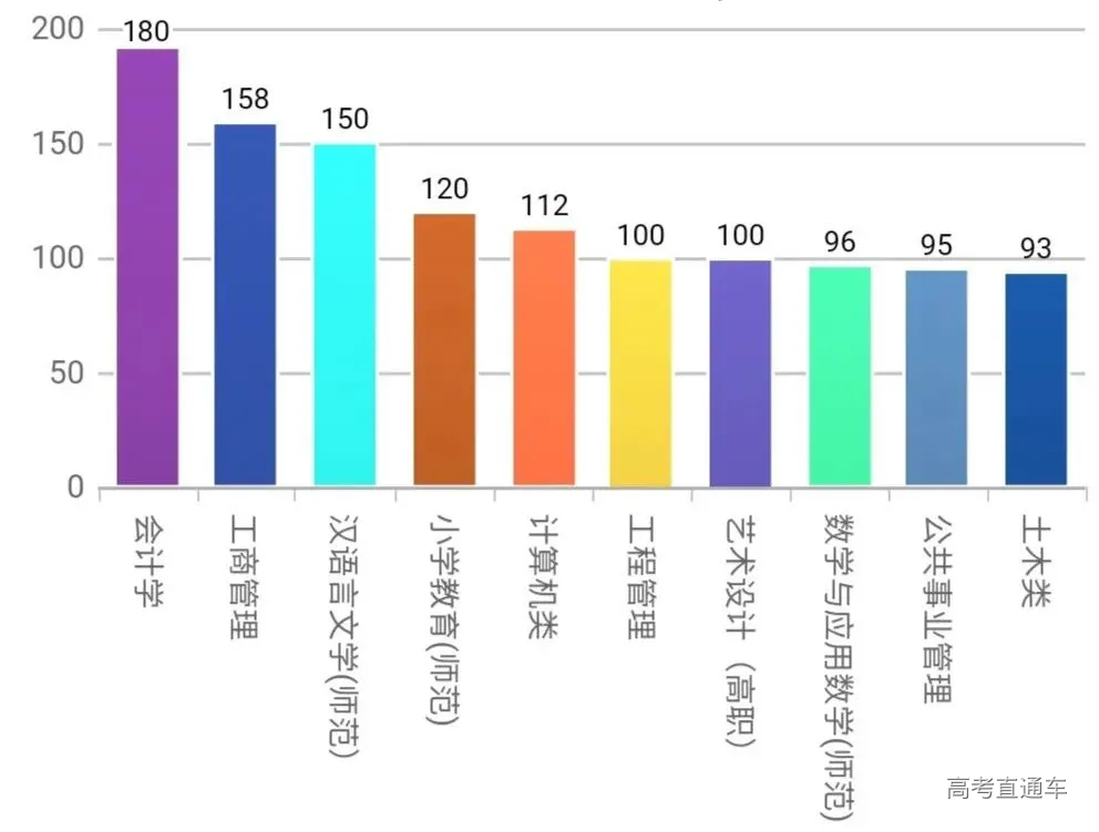 65个专业中,人数最多的5个专业,它们分别是 会计学 工商管理 汉语言文学(师范) 小学教育(师范) 计算机类 录取人数最多专业Top10