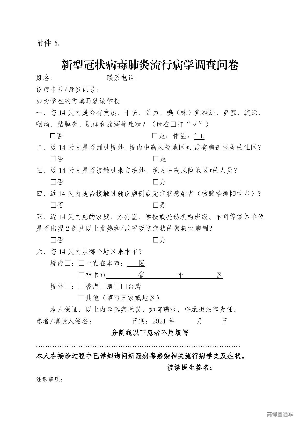 3.所有参检考生须填好《新型冠状病毒感染流行病学史调查问卷》(附件6),由带队教师按排队顺序统一收齐,交医院现场工作人员审核。审核同意后,排队进入体检区域体检。