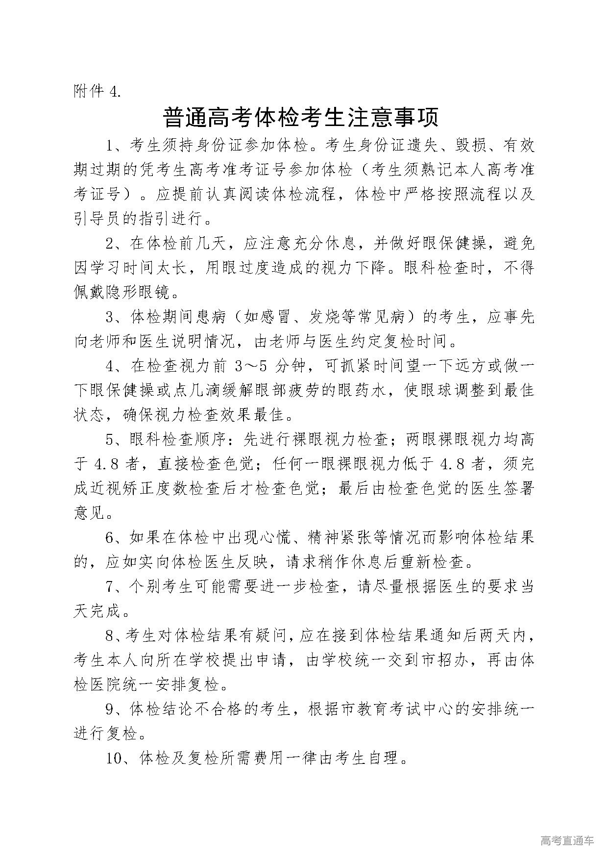 各学校要高度重视高考考生体检工作,须提前将体检安排、流程、项目和有关要求告知考生,组织带队老师和考生学习有关工作和纪律要求并严格遵守,分批分时间段并做好体检疫情防控措施,确保高考体检工作安全有序完成。