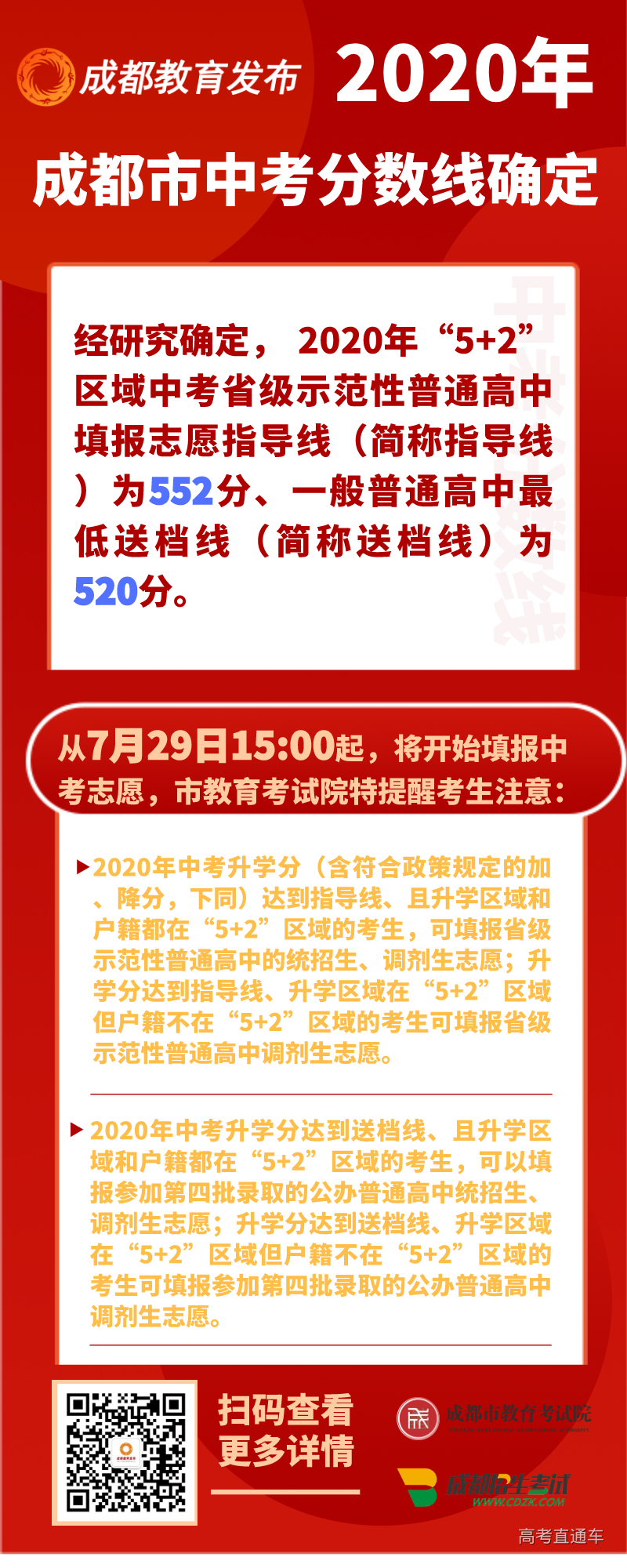 市教育考试院公布的是 “5+2”区域中考分数线 全市共分为16个招生区域,今天市教育考试院公布的是“5+2”区域(即成都天府新区、成都高新区、锦江区、青羊区、金牛区、武侯区、成华区)的中考分数线,由成都市教育考试院统一组织招生录取;其余区(市)县的中考分数线由当地区(市)县教育行政部门划定、公布,并组织招生录取。 为推动城乡共享优质高中教育,今年,石室中学、成都七中和树德中学等“5+2”区域的优质高中面向非“5+2”区域等招收41个班。棠湖中学、双流中学、新都一中、龙泉中学、温江中学、大弯中学、郫都一中、简阳中学、新津中学、大邑中学、彭州中学、金堂中学、崇庆中学、蒲江中学、邛崃一中等非“5+2”区域的优质高中学校面向“5+2”区域招收26个班1300人。 全市高中学校在 “2020年中考网上咨询周”等你 7月27日至8月2日,成都市举办“2020年中考网上咨询周”活动。全市所有普通高中和中职学校(含五年高职学校)开展网上咨询,解答考生和家长的问题,在线帮助考生和家长了解招生政策、招生章程、录取程序,合理填报中考志愿。要认真落实疫情常态化防控要求,不提倡考生及家长到校进行线下、现场咨询。 成都市高中学校招生网上咨询周登录方式: 01 电脑登录, 网址:zkzxz.cdzk.com。 02 微信登录 ▲微信关注成都教育发布(微信号:cdsjyj),菜单栏点击“学在成都”-“中考咨询周”进入。 ▲微信关注成都市教育考试院(微信号:cdjyksy),菜单栏点击“考试招生”-“中考咨询周”进入。 ▲微信关注成都招生考试(微信号:cdzk789),菜单栏点击“中考咨询”-“中考咨询周”进入。 适合的才是最好的 根据市教育考试院安排,考生从7月29日15:00起,填报分批次志愿。 请考生及家长注意: 01 填报适合自己的学校。 填报志愿既要根据考生本人的中考成绩,也要了解相关学校近三年招生计划、录取分数线、办学特色和就学距离等,慎重填报适合考生的学校,切忌盲从跟风,适合的才是最好的! 02 切忌填“死档”。 考生应慎重填报统招生志愿和调剂生志愿,且志愿填报应有适当梯度,如果考生将全部志愿填报某一所学校,录取掉榜风险很大。 03 妥善保管账号密码。 学生志愿填报登陆账号及密码应由考生及其家长妥善保管,不要随意交出密码。如果家长交出密码填报志愿后,怎样补救呢?家长可到属地区(市)县招考机构重置密码,重新填报志愿。录取工作将以考生及其家长最终填报提交的志愿为准。 每一名考生 都有机会就读高中学校 成都市已全面普及高中阶段教育,本市每一名初中毕业生均可升入普通高中或中职类学校就读。2020年全市中考报名人数12.41万人(含借考生),按照教育部、省教育厅关于普职招生规模大体相当的要求,结合成都实际,普通高中招生计划为74760名,达全市中考报名学生总数的60%。 根据教育部和省教育厅有关规定,市、区(市)县教育行政部门将公办省级示范性普通高中统招生计划的50%合理分配到区域内的初中学校,如“5+2”区域5400余名考生已提前获得省级示范高中指标到校生资格。其中,市级统分指标生中考成绩达到省级示范高中志愿指导线(俗称省重线)以上即可,而部分省级示范性普通高中的区域指标到校生按政策规定不参加中考。 如果选择中等职业教育,你可以通过“中职—高职专科—应用型本科—研究生”衔接推进计划铺就大学成才之路。目前,成都市52所中职学校与40所高职院校签订了3+2、五年贯通培养联办模式。今年,全市有24373名中职类考生达到对口高考或高职单招录取分数线。 普职融通实验班 让你的高中可以选择 为进一步深化普通高中育人方式改革,近年来,成都市积极探索普职教育融通,给予学生二次选择机会,即在高一年级学习期间,经过学业考核,达到对口普通高中学校要求的可转入普通高中就读,普通高中学生也可申请转入中职学校就读。2020年,全市19所中职学校与19所普通高中学校结对举办普职融通实验班,共计招生1795人。