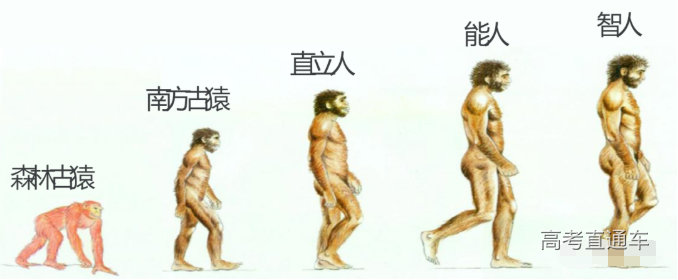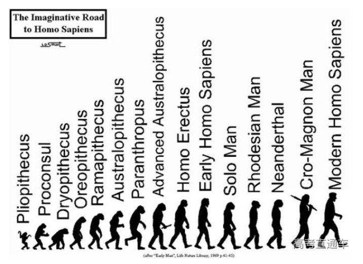 ►从左到右分别是:上猿、原康修尔猿、森林古猿、山猿、腊玛古猿、南方古猿、傍人、高等南方古猿、直立人、早期智人、梭罗人、罗德西亚人、尼安德特人、克罗马农人、现代人。