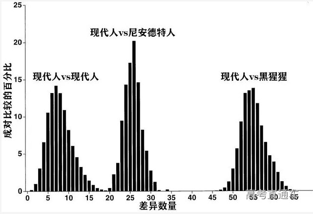 基于线粒体基因比较发现尼人和现代人的差别,虽然比不上人类-黑猩猩的差别,但是明显比现代人-现代人的差别更大 | 图源:Krings M, et al. 1997.