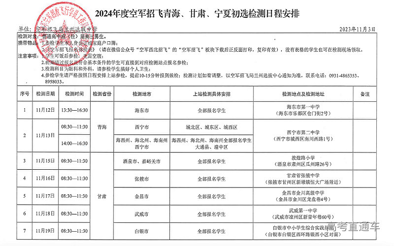 2.方法步骤:空军招飞局兰州选拔中心计划在西宁市、海东市设置共2个初选检测站,组织报名学生就近上站参检。具体检测时间和设站地点将根据我省报名学生分布情况,直接与相关教育考试招生机构对接协调。