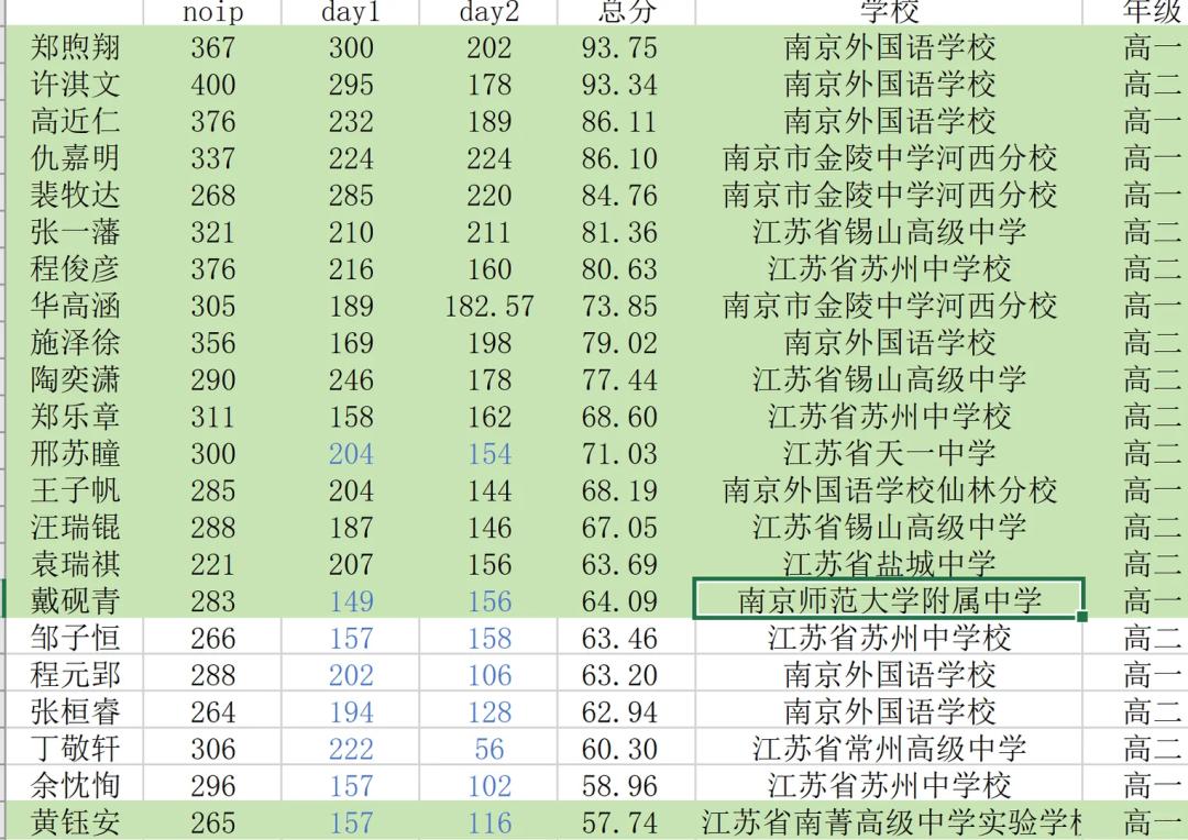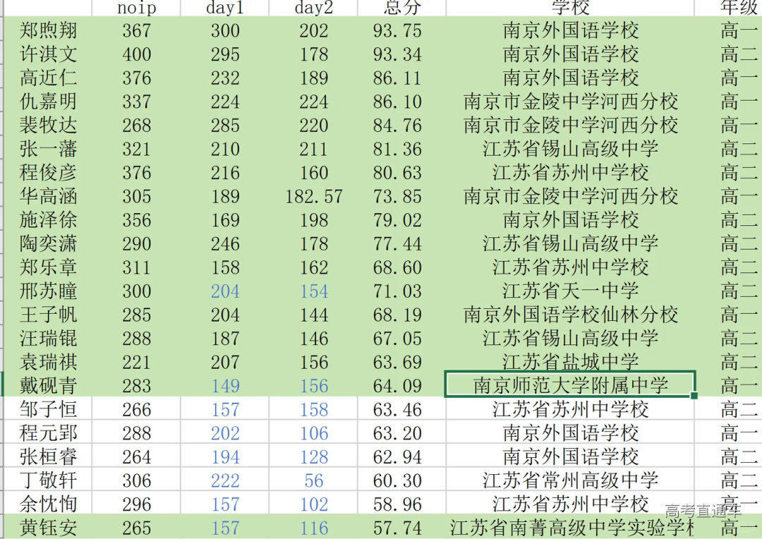 如果按省队名额分配来计算,江苏省A+B共计17人(其中A类中要求,女性选手仅需本省女生第一即可入选,不设分数硬线)。按此规则,下表中绿色底的17名信竞生将入选江苏省队。