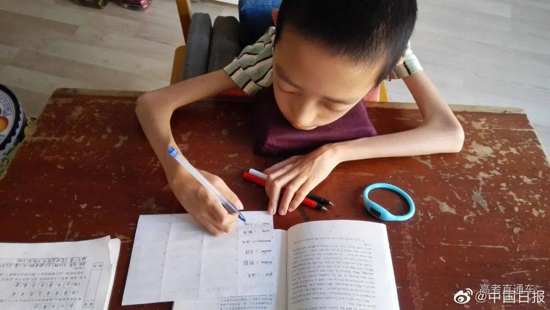 用仅剩一点儿肌肉力量的双手,他完成了一张又一张试卷,一天最多做了20多张,经常做到凌晨一两点,每天疲倦到沾床就能睡着。
