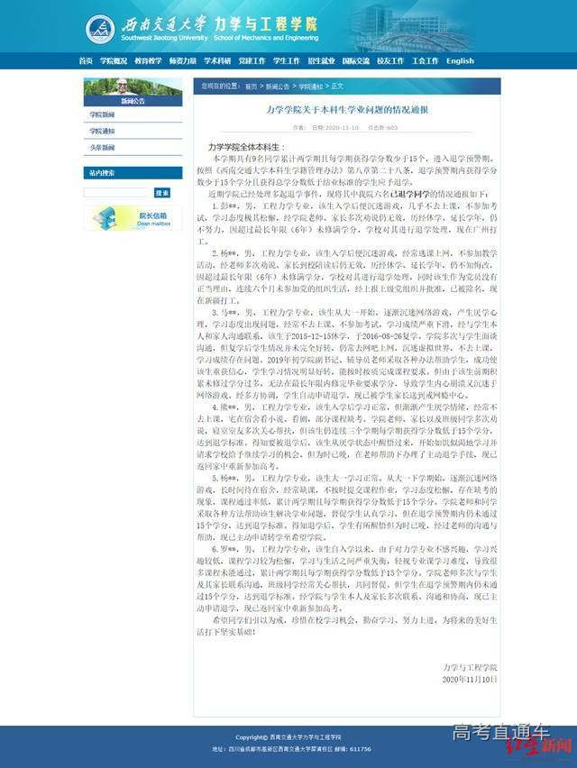 2020年11月10日,西南交通大学力学与工程学院网站发布了一则通报。