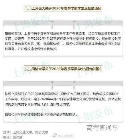 上海交通大学、同济大学发布了2020年春季学期学生返校的通知,定于4月27日起启动学生分期分批有序返校。