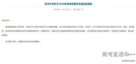 东华大学于4月22日发布2020年春季学期学生返校的通知。