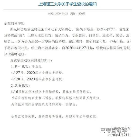 上海理工大学于4月21日发布通知,自4月27日起,学校将安排学生分期分批错峰返校。