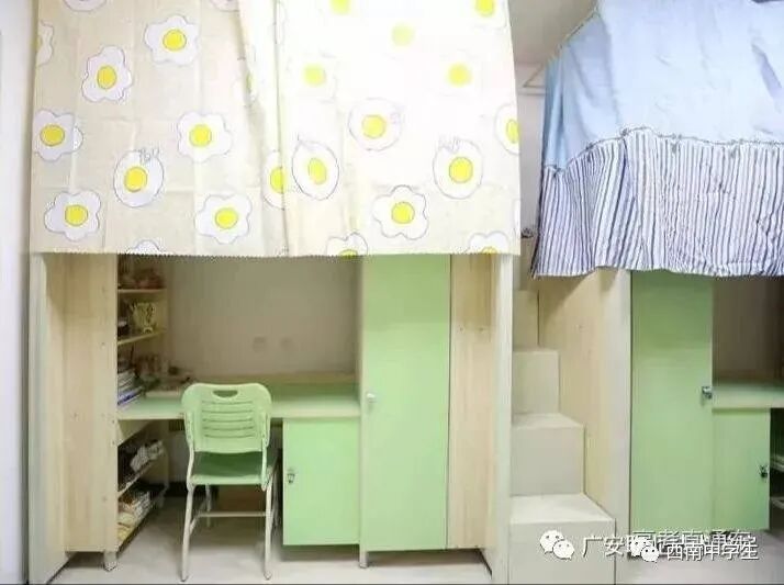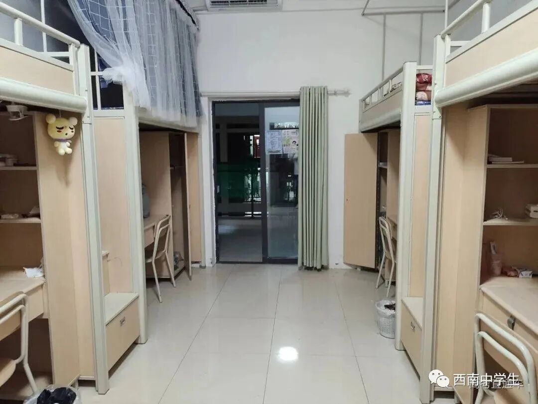 学生宿舍为4-6人间,有上床下桌,也有上下床,宿舍环境舒适,并且设有独立卫生间、冲凉房、阳台、储物柜、办公台、太阳能热水等生活设施,宿舍是24小时供应热水。(宿舍1、2栋没有独卫)(关注西南中学生(ID:sczxswx),获取更多最新四川高考资讯)